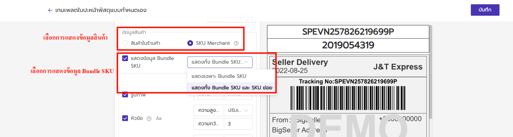 1. ระบบจะแสดงข้อมูลสินค้าบนใบปะหน้าพัสดุตามการเลือกข้อมูลสินค้าของคุณ โดยจะมีการแสดงด้วย "สินค้าในร้านค้า" และ "SKU Merchant"