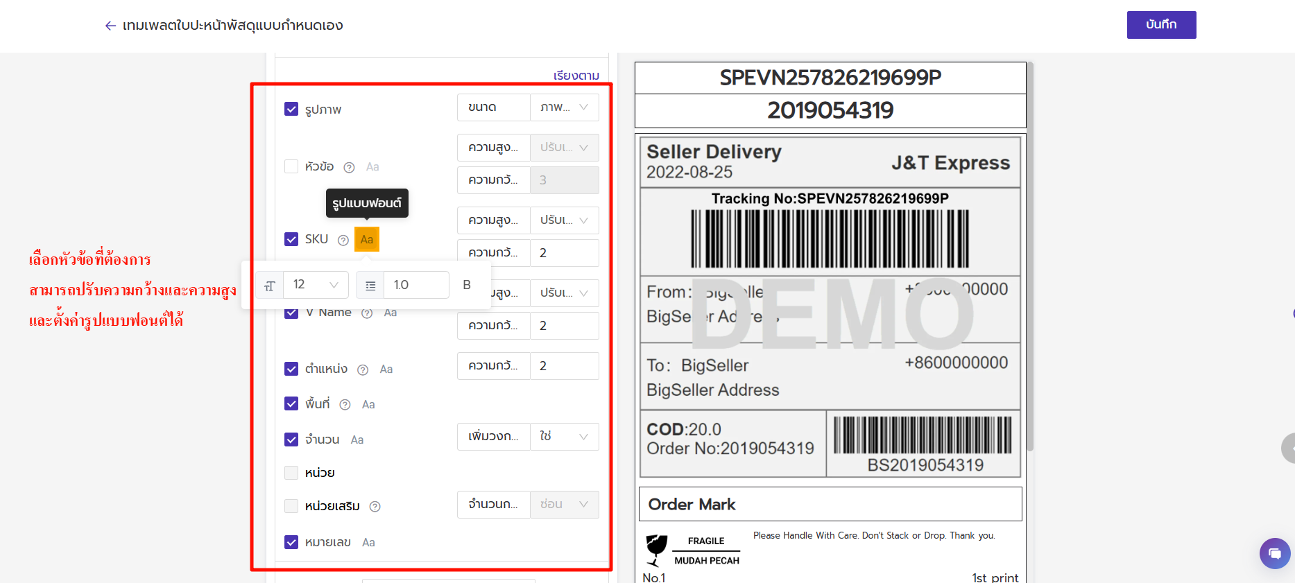 4. ขนาดตัวอักษร: การตั้งค่าขนาดตัวอักษานี้จะมีผลเฉพาะข้อมูลสินค้าบนใบปะหน้าเท่านั้น จะไม่มีผลกับข้อมูลผู้ส่งและผู้รับ