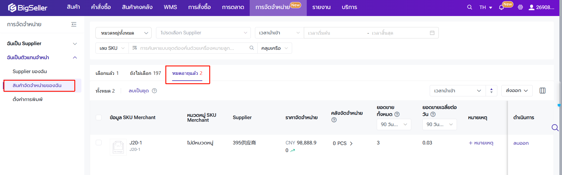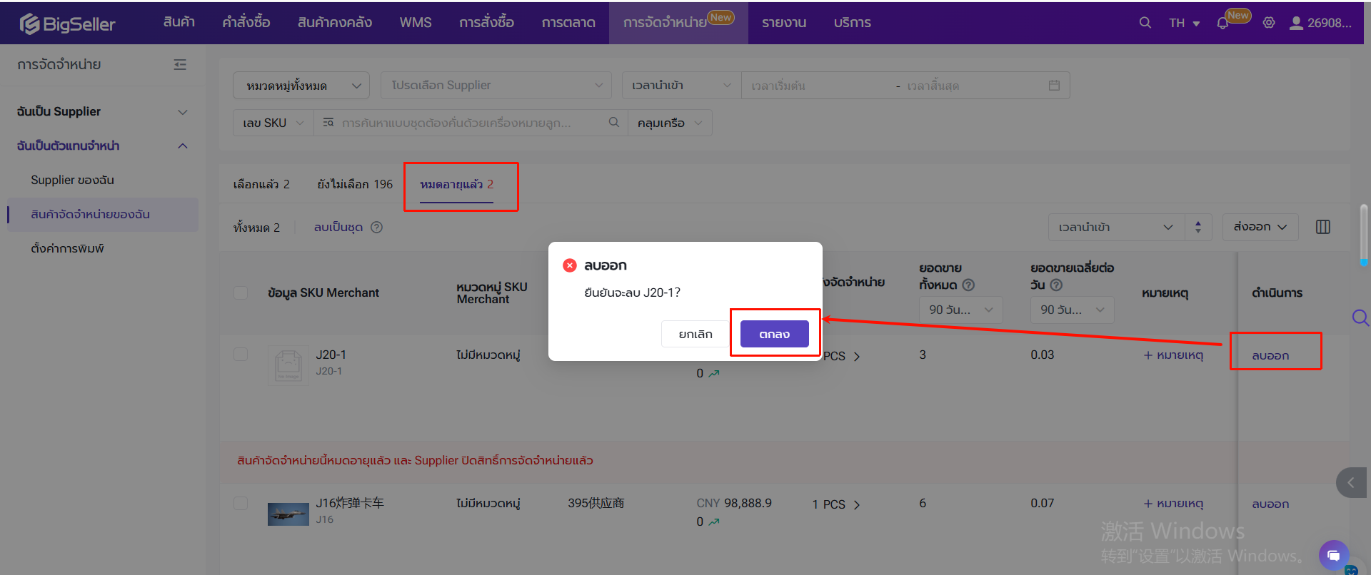 สามารถดำเนินการลบสินค้าจัดจำหน่ายที่หมดอายุ คลิกตกลง สถานะสินค้าจัดจำหน่ายที่ถูกลบจะอัปเดตเป็น "ยังไม่เลือก"