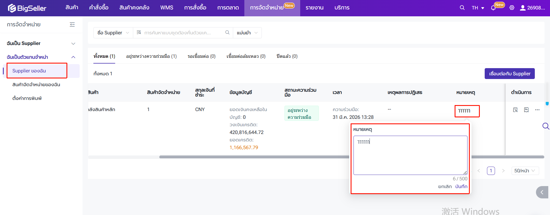 ◾ หากผู้ใช้งานมี Supplier หลายราย แนะนำให้บันทึกหมายเหตุสำหรับแต่ละ Supplier ในรายการ "Supplier ของฉัน" เพื่อค้นหาได้อย่างรวดเร็ว