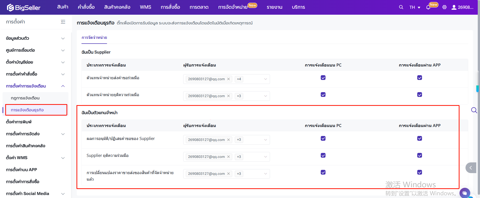 แนะนำให้เปิดการแจ้งเตือนเพื่อได้รับข้อความเกี่ยวกับ "ผลการอนุมัติ/ปฏิเสธคำขอของ Supplier" "Supplier ยุติความร่วมมือ" และ "การเปลี่ยนแปลงราคาขายส่งของสินค้าที่จัดจำหน่ายแล้ว" ผู้ใช้งานสามารถตั้งค่าให้ระบบแจ้งเตือนผ่าน PC และ APP