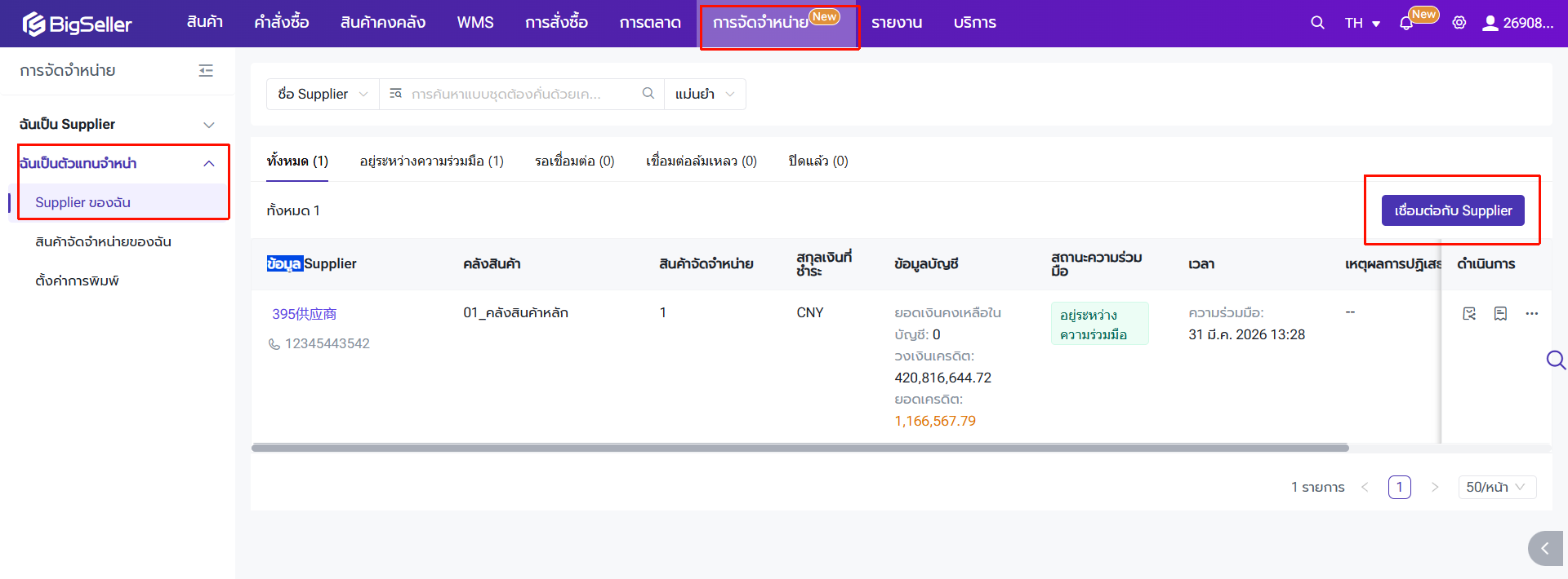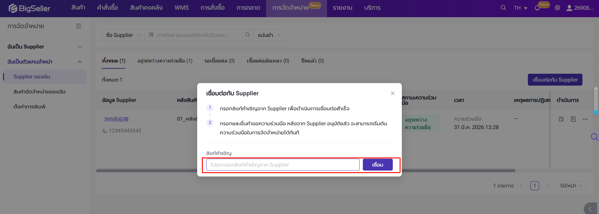 เข้าสู่ระบบ BigSeller ไปยังเมนู การจัดจำหน่าย > ฉันเป็นตัวแทนจำหน่าย > Supplier ของฉัน > คลิก "เชื่อมต่อกับ Supplier" ใส่ลิงก์เชิญที่ Supplier ส่งให้ และรอการอนุมัติจาก Supplier เพื่อสร้างความร่วมมือกัน