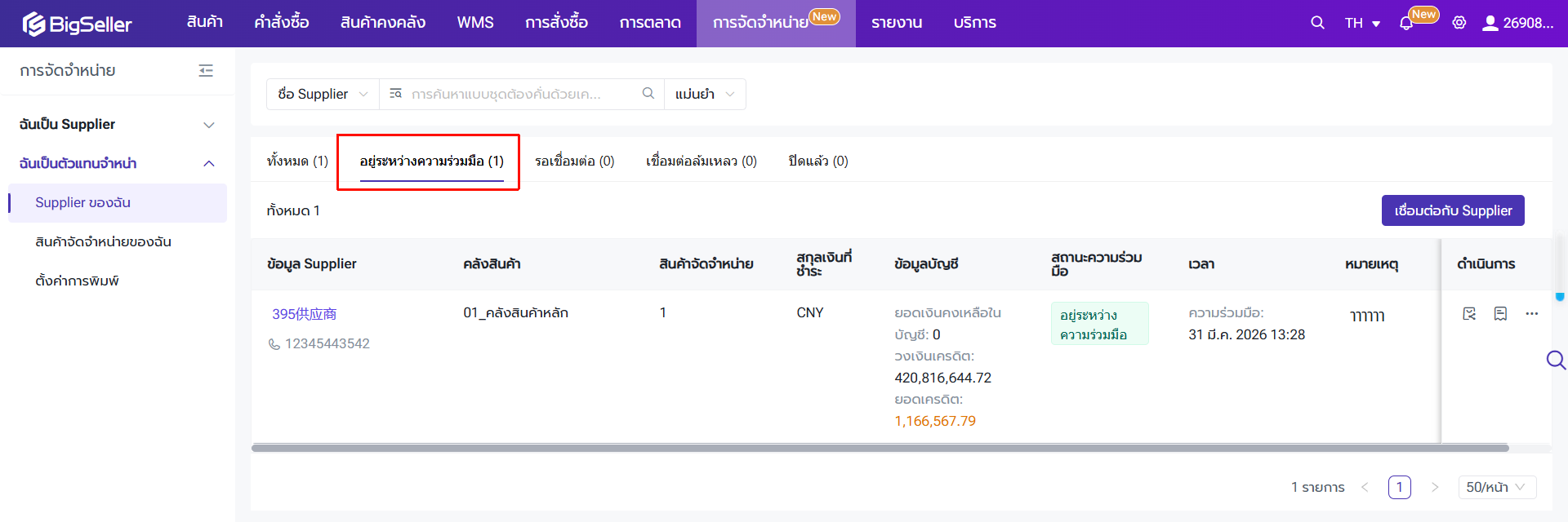 หลังจาก Supplier กดยอมรับ สถานะ Supplier ในรายการ "Supplier ของฉัน" จะเปลี่ยนเป็น "อยู่ระหว่างความร่วมมือ"