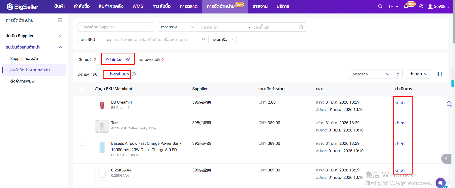 ในรายการ "สินค้าจัดจำหน่ายของฉัน" > "ยังไม่เลือก" ลิกปุ่ม "นำเข้า" ของ SKU แล้ว ระบบจะสร้าง SKU Merchant โดยอัตโนมัติ
