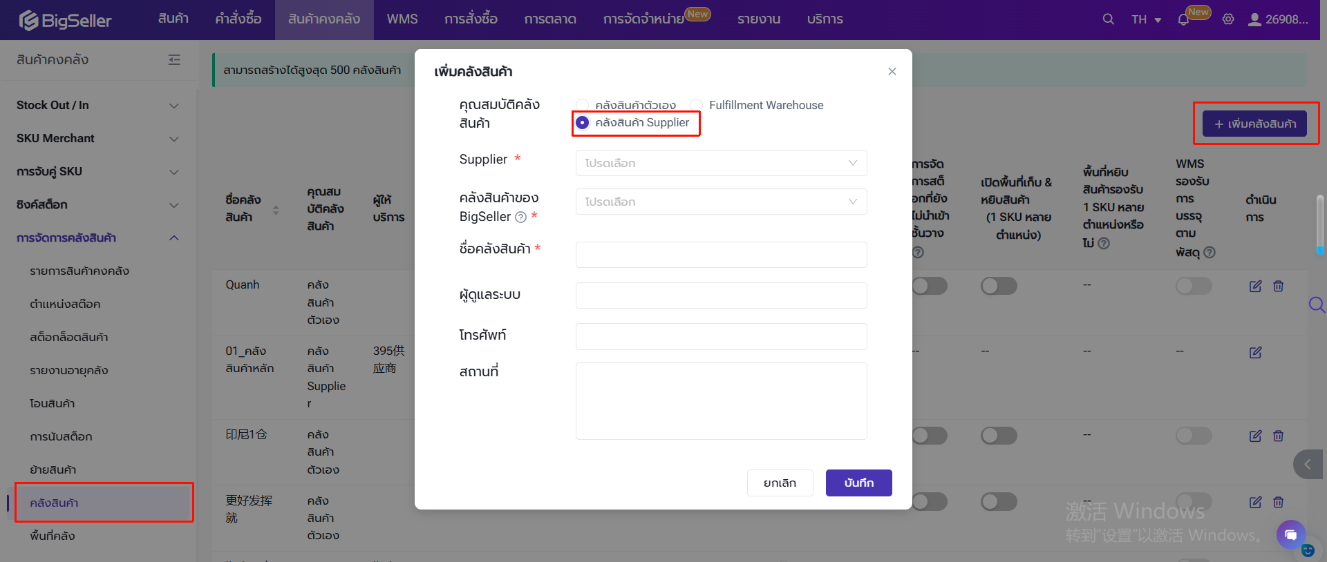 หลังจาก Supplier แก้ไข/เพิ่มคลังจัดหาแล้ว ระบบจะไม่สร้างคลังสินค้า Supplier ที่ฝั่งตัวแทนจำหน่ายโดยอัตโนมัติ ตัวแทนจำหน่ายต้องเพิ่มคลังสินค้าด้วยตนเอง และไปแก้ไขหรือสร้างคลังที่เกี่ยวข้องในร้านค้าแพลตฟอร์ม พร้อมอัปเดตที่อยู่รับสินค้าของร้านค้าและคลังสินค้าในระบบ BigSeller ให้ตรงกัน