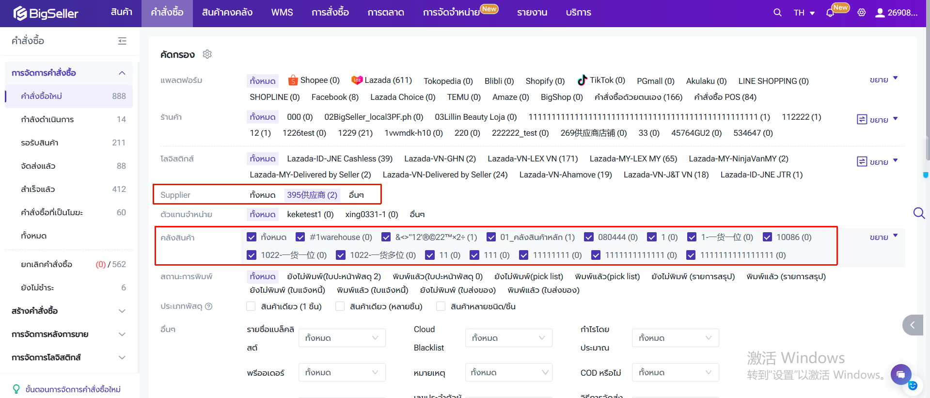 ไปยังเมนู การจัดการคำสั่งซื้อ > คำสั่งซื้อใหม่ ตัวแทนจำหน่ายสามารถคัดกรองคำสั่งซื้อจัดจำหน่ายตามชื่อ Supplier หรือคลังสินค้า
