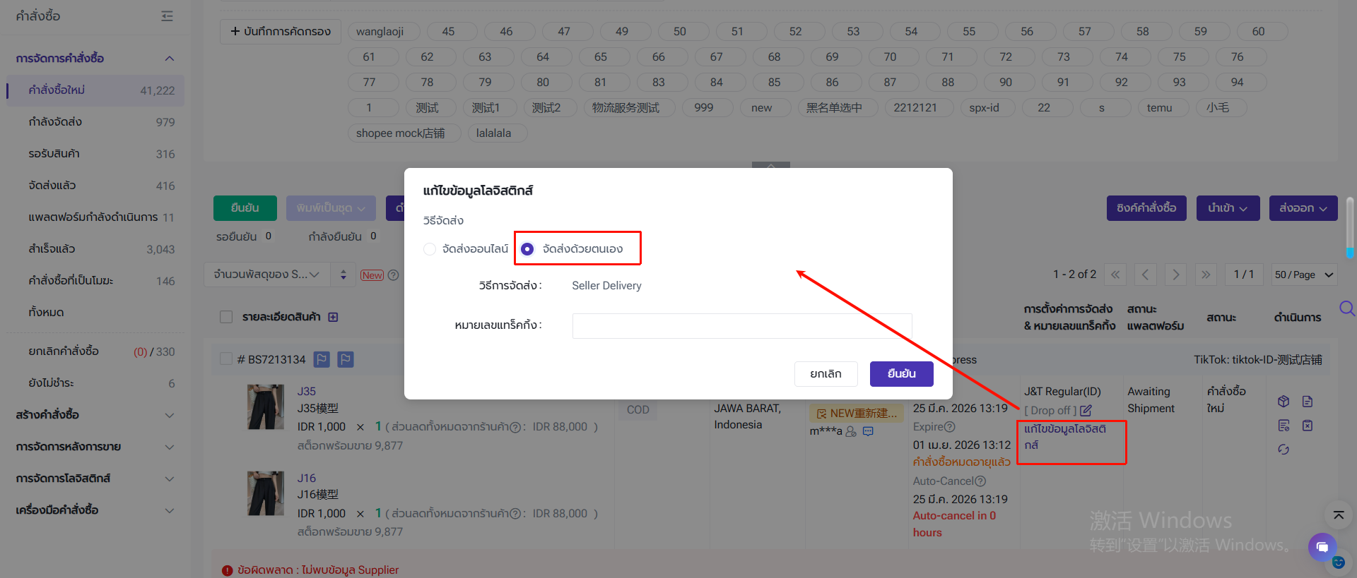 หากเลือก "จัดส่งด้วยตนเอง"(ยกเว้นแพลตฟอร์ม Temu) เมื่ออัปเดตคำสั่งซื้อ ตัวแทนจำหน่ายไม่ต้องกรอกหมายเลขแทร็คกิ้ง โดย Supplier จะจัดส่งและกรอกหมายเลขแทร็คกิ้งแทน ซึ่งระบบจะอัปเดตข้อมูลหมายเลขแทร็คกิ้งในฝั่งตัวแทนจำหน่ายเช่นกัน