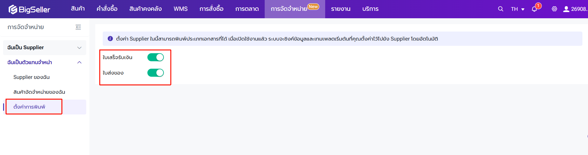 ในเมนู "ฉันเป็นตัวแทนจำหน่าย" > "ตั้งค่าการพิมพ์" ตัวแทนจำหน่ายสามารถตั้งค่าสิทธิ์การพิมพ์ใบเสร็จรับเงินและใบสั่งของของ Supplier ได้