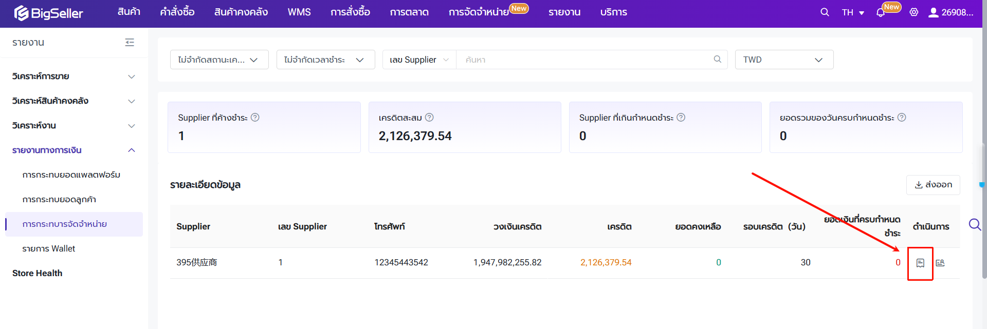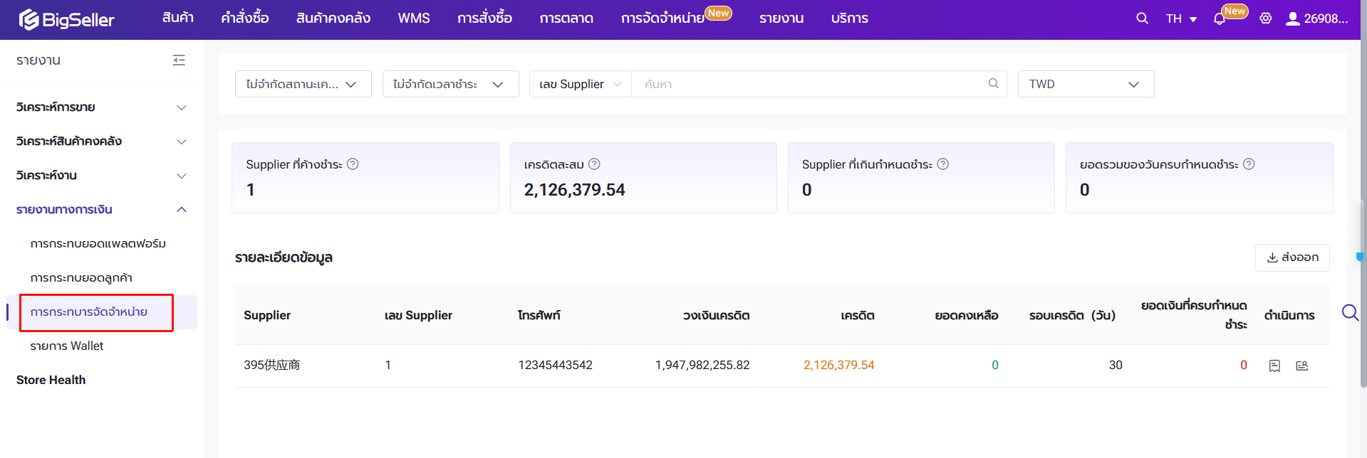 ตัวแทนจำหน่ายสามารถตรวจสอบรายละเอียดค่าใช้จ่าย ยอดคงเหลือ และสถานะเครดิตกับ Supplier แต่ละรายใน BigSeller ได้ทุกเมื่อ
