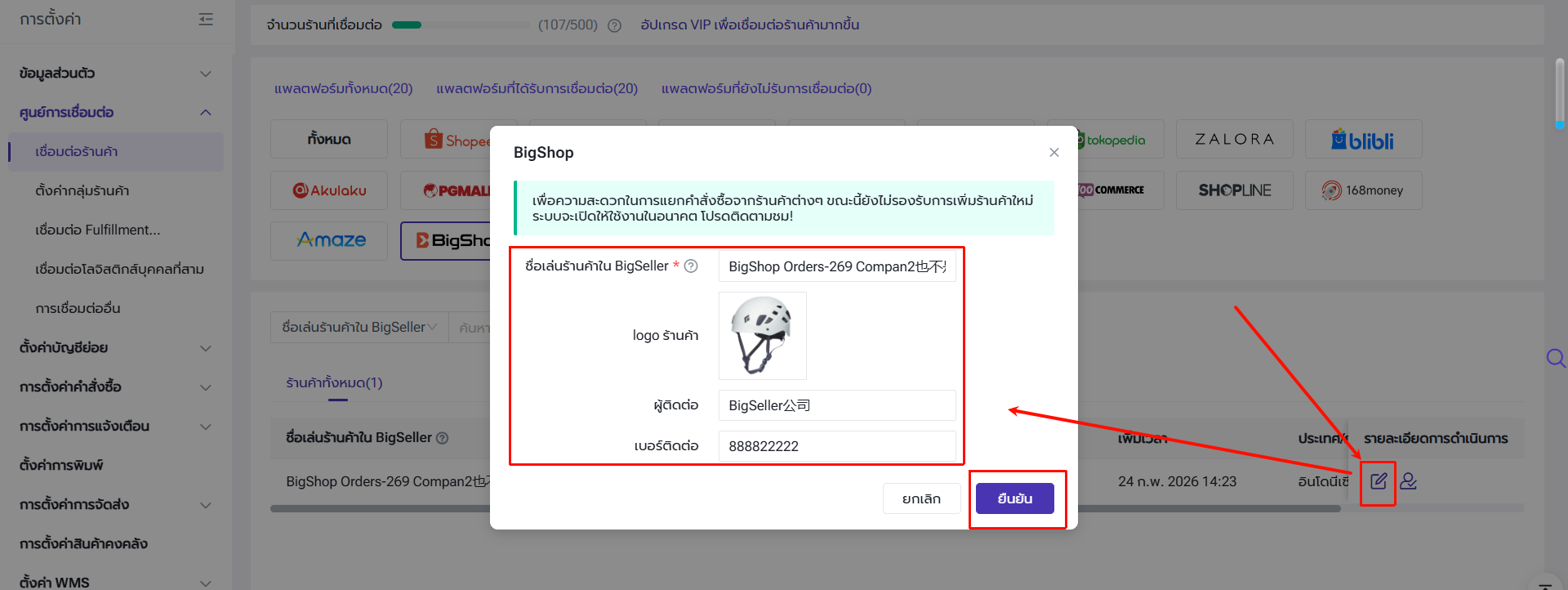 กดแก้ไขข้อมูล > กำหนดชื่อเล่นร้านค้าใน BigSeller, logo ร้านค้า, ผู้ติดต่อ และเบอร์ติดต่อ > กด "ยืนยัน"