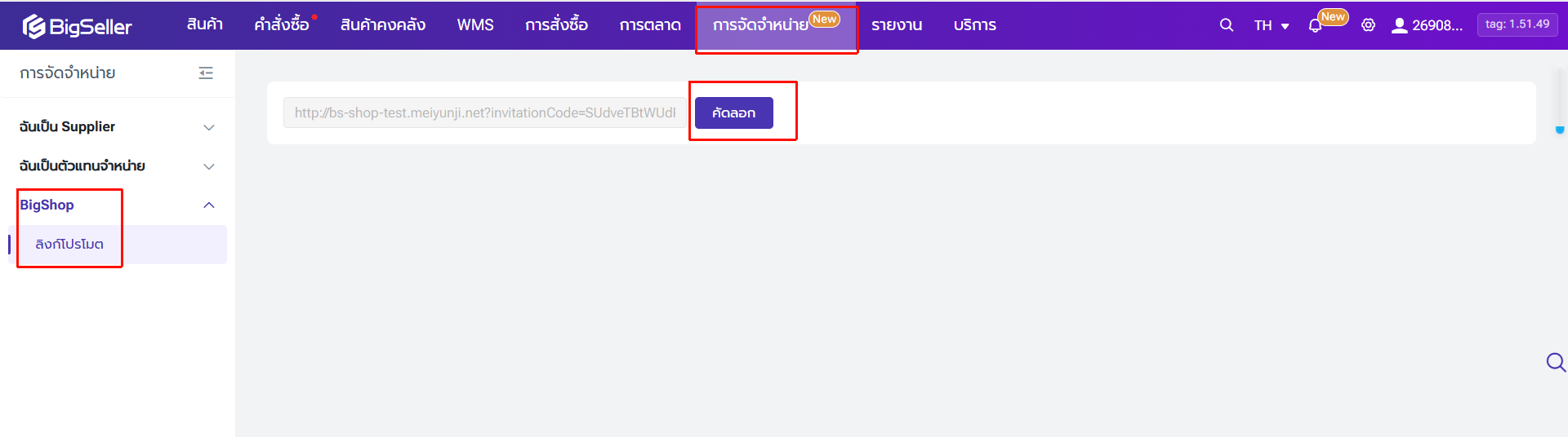ไปที่เมนู การจัดจำหน่าย > BigShop > ลิงก์โปรโมต > กดคัดลอก > ส่งลิงก์ให้กับลูกค้าผ่าน Line, Facebook หรืออีเมล เป็นต้น