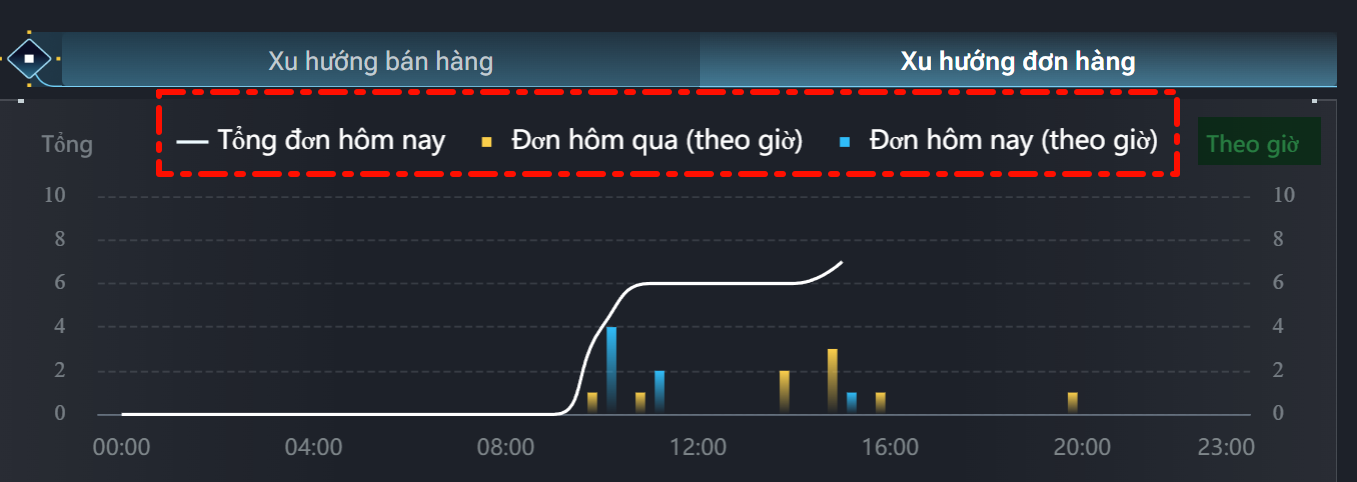 Có thể xem biểu đồ theo Doanh thu hôm nay, Doanh thu mỗi giờ hôm qua, Doanh thu mỗi giờ hôm nay