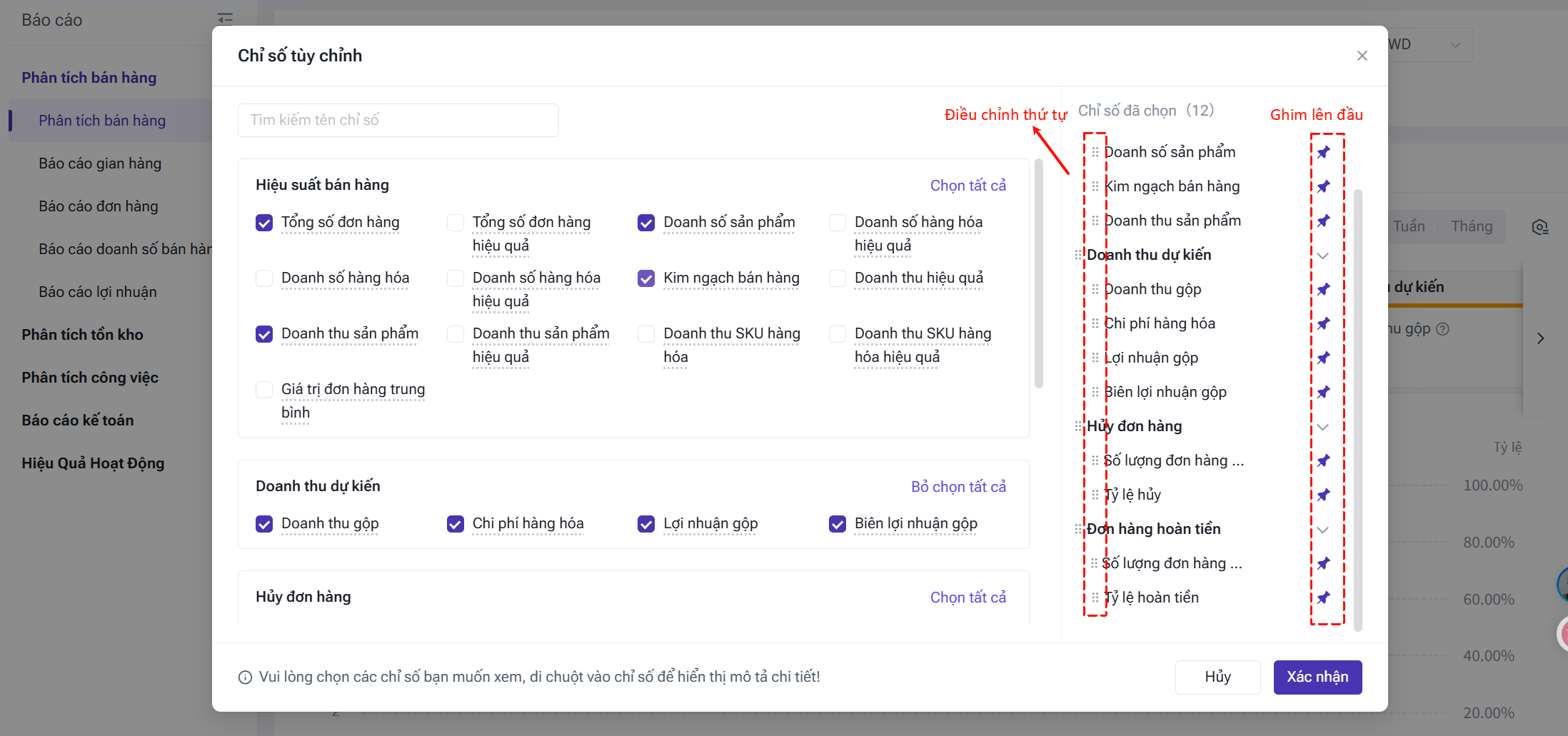 Tập trung vào 5 loại hình nghiệp vụ: Hiệu suất bán hàng, Doanh thu dự kiến, Đơn hàng hủy, Đơn hàng hoàn tiền và Sản phẩm trợ giá, người dùng có thể tùy chỉnh trường thông tin hiển thị (Cố định/Ghim lên đầu).