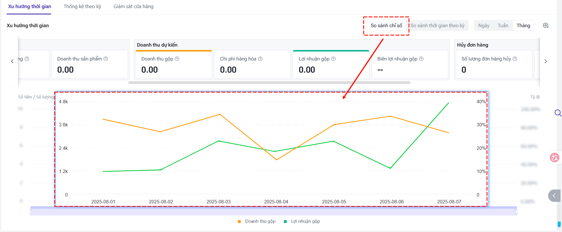 • So sánh chỉ số: Cho phép tích chọn tối đa 5 chỉ số khác nhau để so sánh xu hướng ngang (Ví dụ: Chỉ số Doanh thu gộp vs Chỉ số Lợi nhuận gộp).