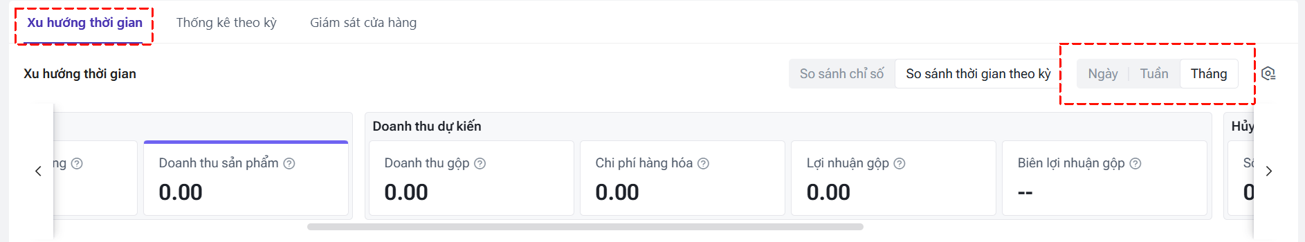 Biểu đồ xu hướng: Hỗ trợ xem theo mốc Thời gian: Ngày / Tuần / Tháng.
