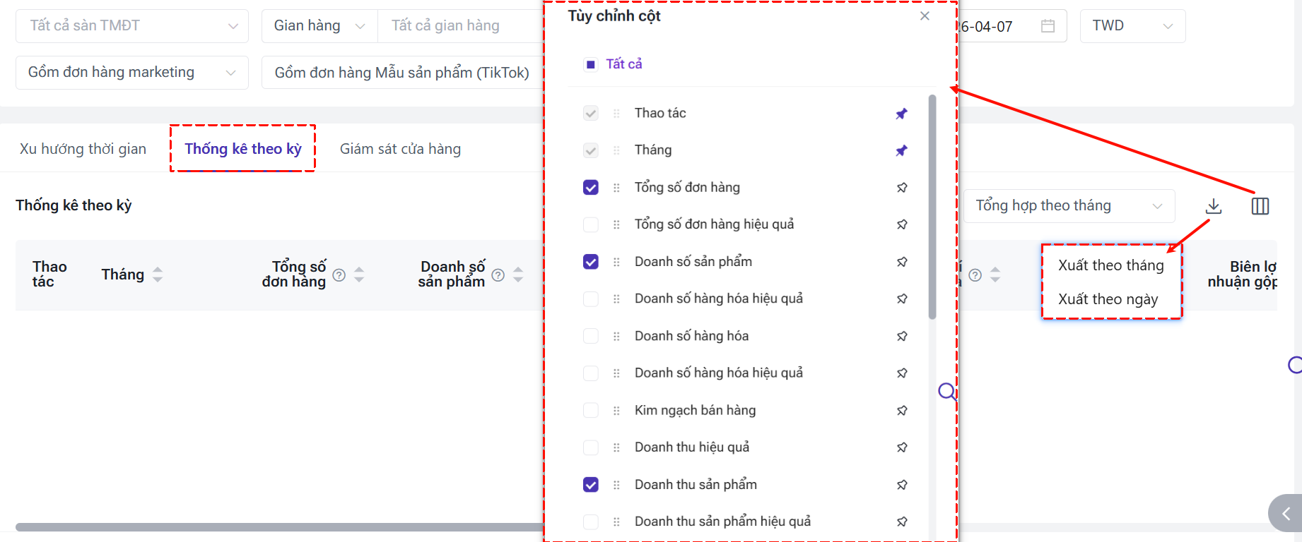 • Tùy chỉnh & Xuất file: Hỗ trợ tùy chỉnh cột hiển thị, có thể ghim lên đầu hoặc ẩn các chỉ số theo nhu cầu, hỗ trợ xuất báo cáo theo Ngày/Tháng.