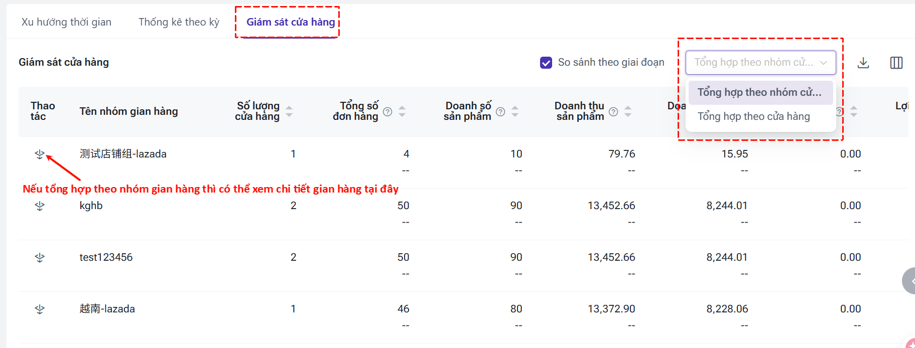 • Tổng hợp dữ liệu: Thống kê dữ liệu đơn hàng theo Gian hàng hoặc theo Nhóm gian hàng, hỗ trợ xem chi tiết từng gian hàng từ nhóm gian hàng.