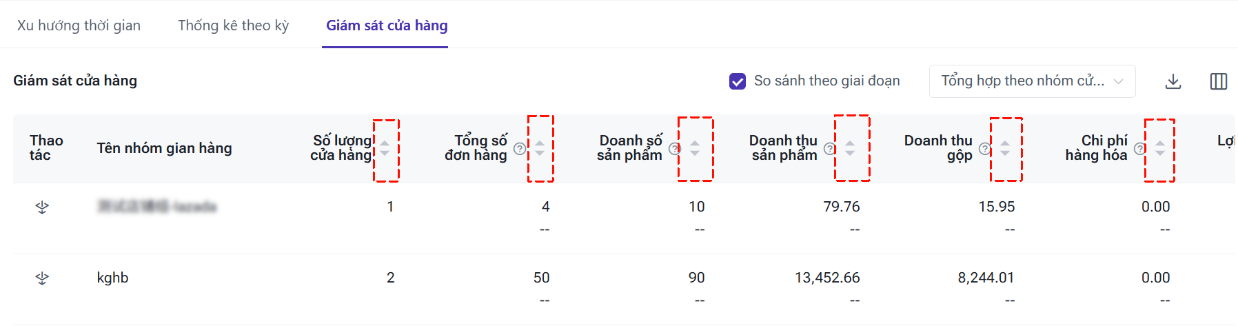 • Sắp xếp và So sánh: Các cột chỉ số hỗ trợ sắp xếp tăng dần/giảm dần, giúp nhanh chóng định vị các gian hàng đạt hiệu suất cao hoặc các gian hàng tiềm năng cần tối ưu.
