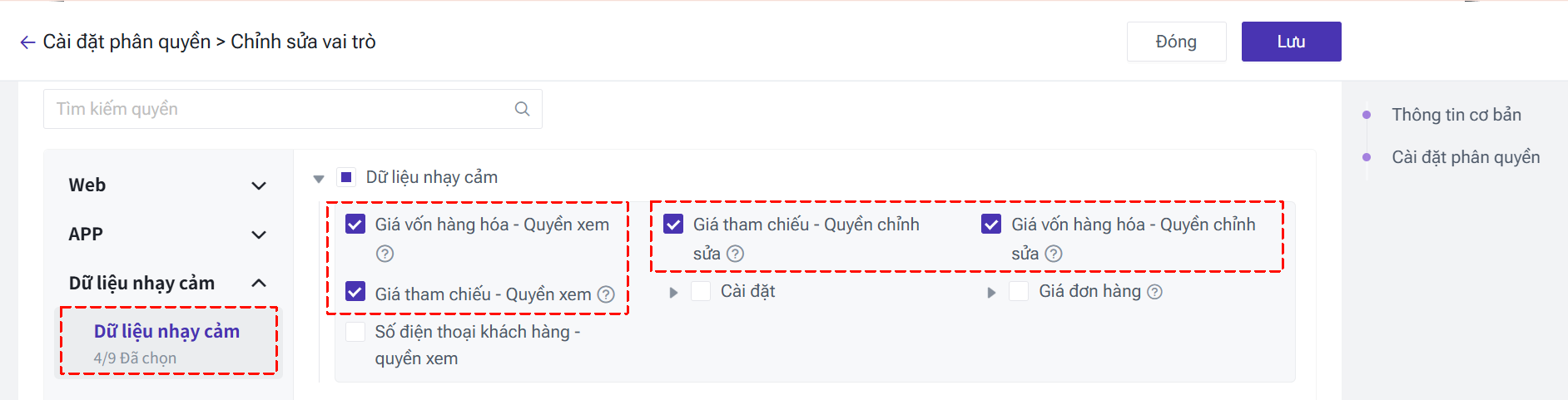 2. Dữ liệu nhạy cảm: Vì Giá vốn hàng hóa, Lợi nhuận gộp và Tỷ suất lợi nhuận gộp là những dữ liệu nhạy cảm, nên các thông tin này chỉ hiển thị tài khoản phụ được tích chọn đồng thời các quyền sau, nếu không có các quyền này, các ô dữ liệu tương ứng sẽ hiển thị dưới dạng "****":