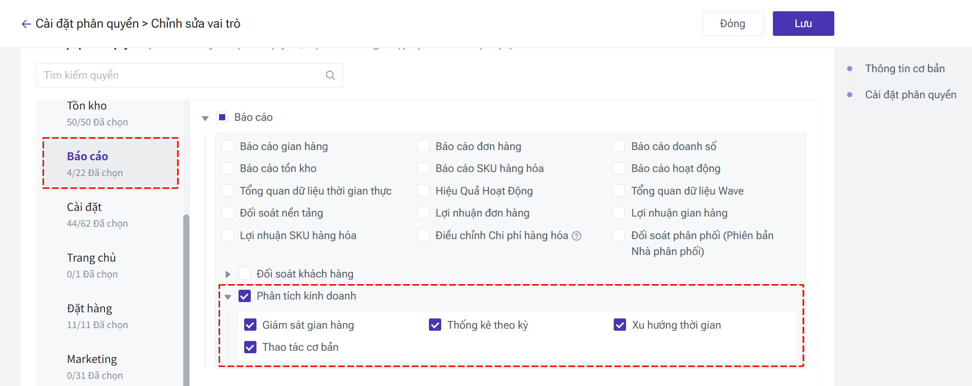1. Web > Báo cáo > Phân tích kinh doanh: Tích chọn các quyền Giám sát gian hàng, Thống kê theo kỳ, Xu hướng thời gian và Thao tác cơ bản.