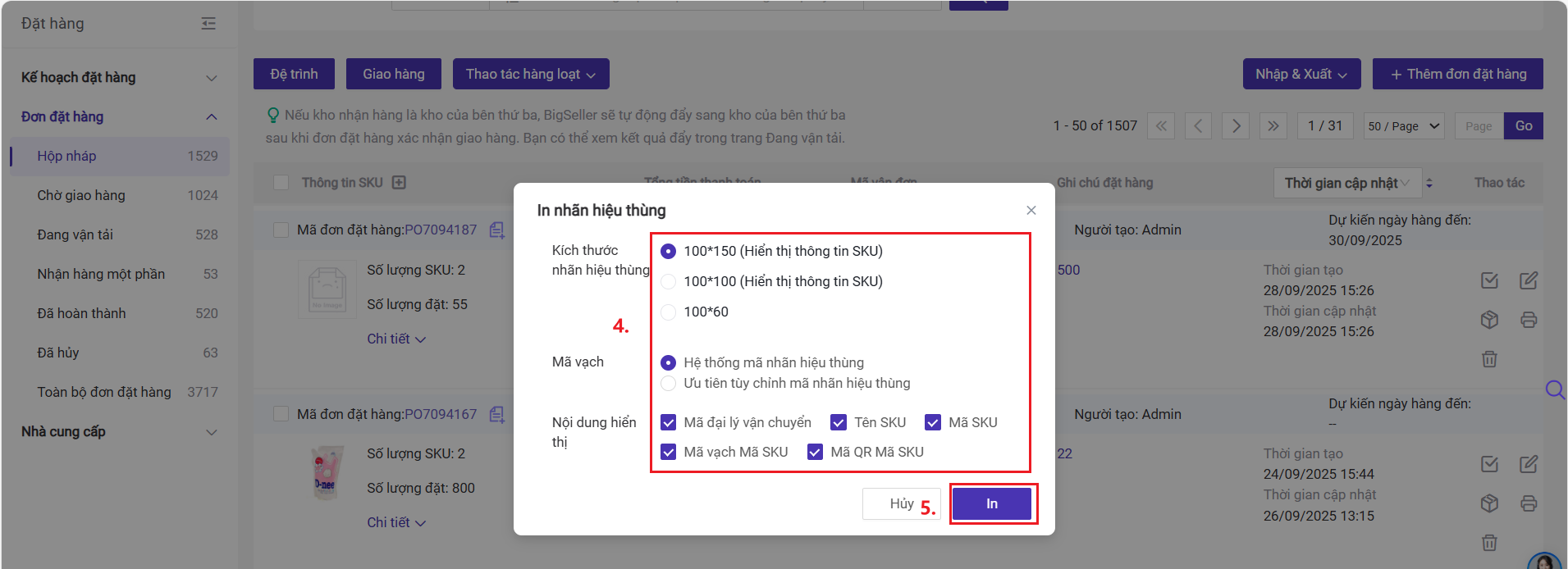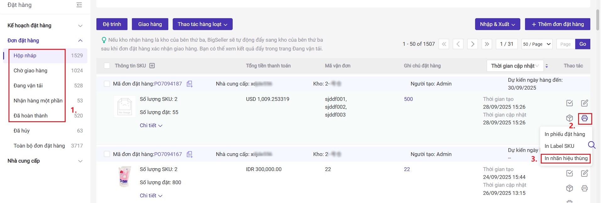 Bạn có thể in mã nhãn hiệu thùng tại các mục [Hộp nháp], [Chờ giao hàng], [Đang vận tải], [Đã hoàn thành] của mô-đun đặt hàng.