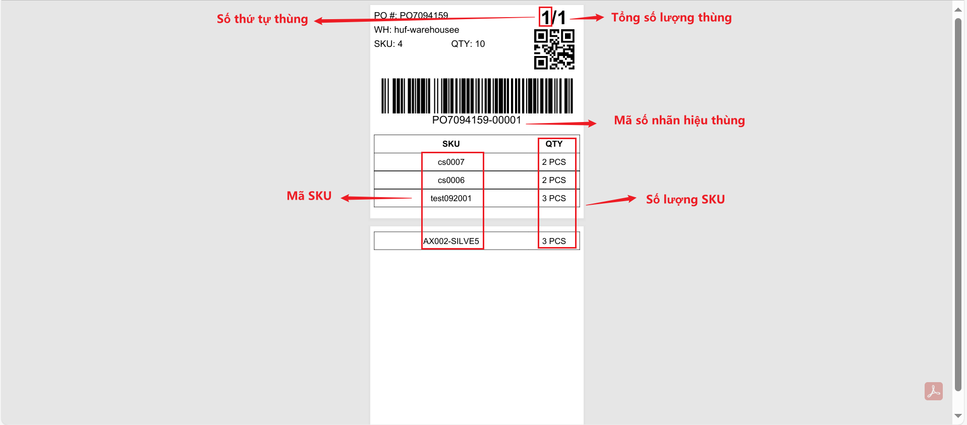 Khi nhấp vào In nhãn hiệu thùng, bạn có thể xem trước Mã nhãn hiệu thùng.