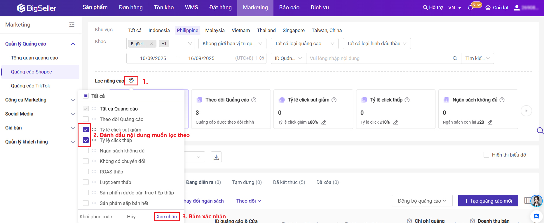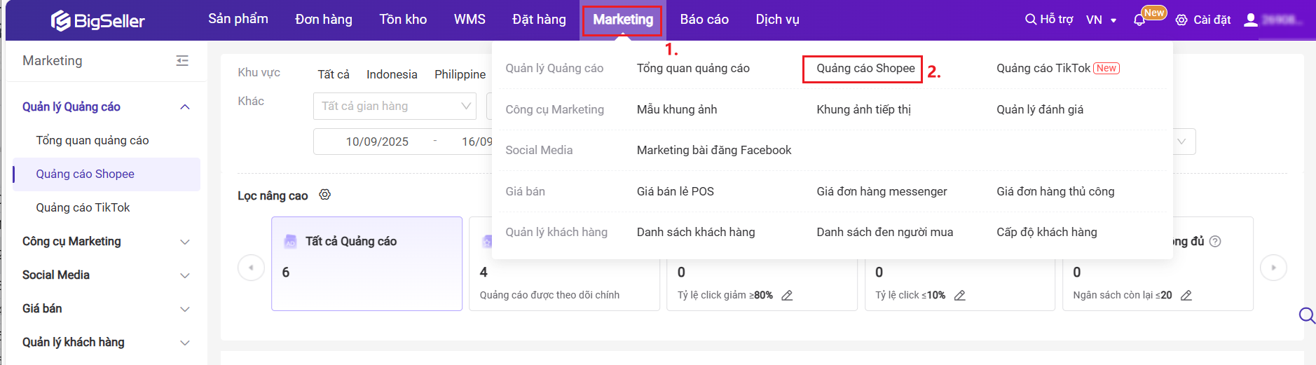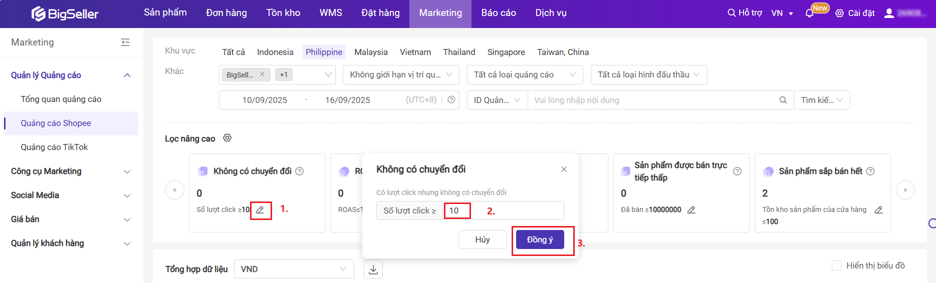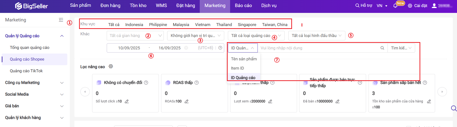 ⑦ Tìm kiếm cụ thể: Lọc cụ thể bằng cách tìm kiếm chính xác hoặc tìm kiếm mờ Tên sản phẩm , Item ID và ID quảng cáo.