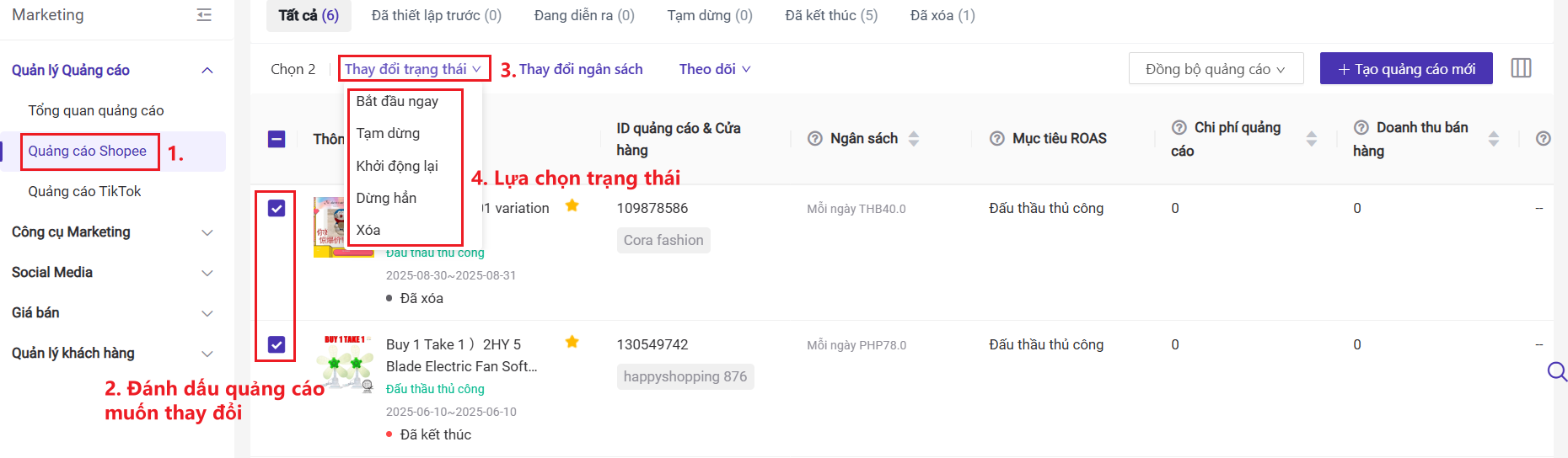 Bạn có thể vào danh sách quảng cáo Shopee thay đổi trạng thái, ngân sách hàng loạt quảng cáo còn trạng thái theo dõi quảng cáo nữa.