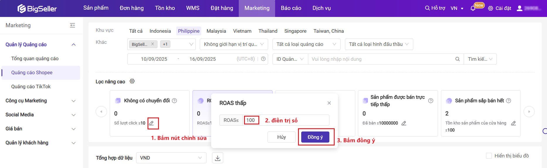 Trước khi lọc nâng cao, bạn cần cài đặt các trị số trước để định nghĩa các chỉ số trước, như ROAS thấp thì bạn phải đặt một trị số trước để biết theo bạn như nào mới là ROAS thấp. Như Mình có thể điền trị số 100 thì sẽ tính khi ROAS ≤100 sẽ là ROAS thấp, thế thì khi bạn lọc ROAS thấp thì các quảng cáo ROAS ≤100 sẽ được lọc ra.