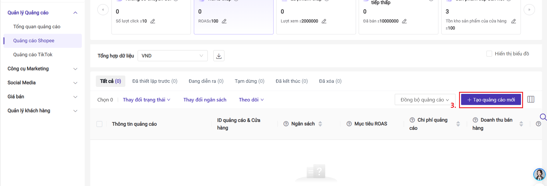 Bước 1: Bấm vào Mô-đun Marketing > Bấm Quảng cáo Shopee> Bấm nút + Tạo Quảng cáo mới