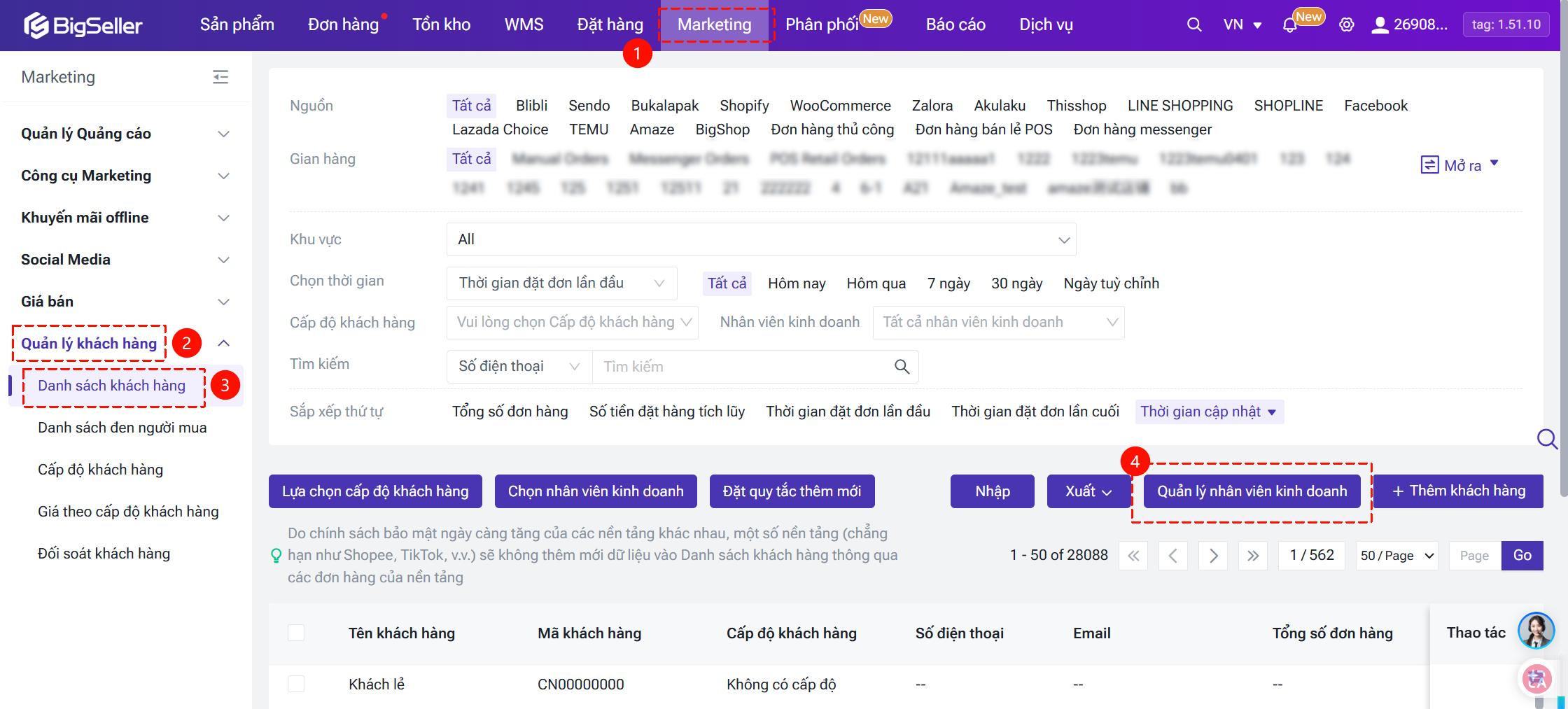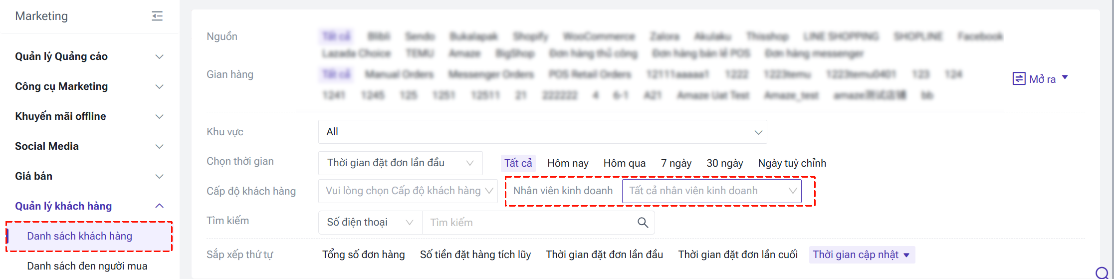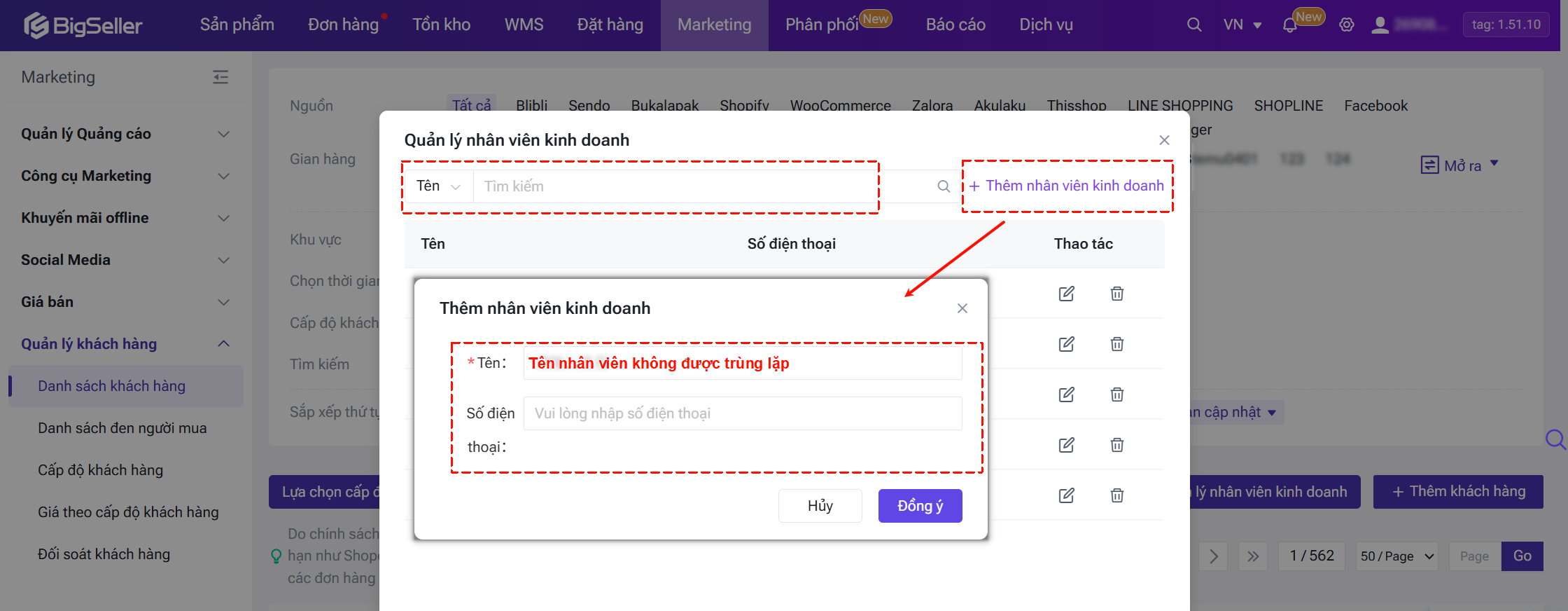 Lối vào: mô-dun Marketing > Quản lý khách hàng > Danh sách khách hàng > Nhấp vào nút [Quản lý nhân viên kinh doanh].