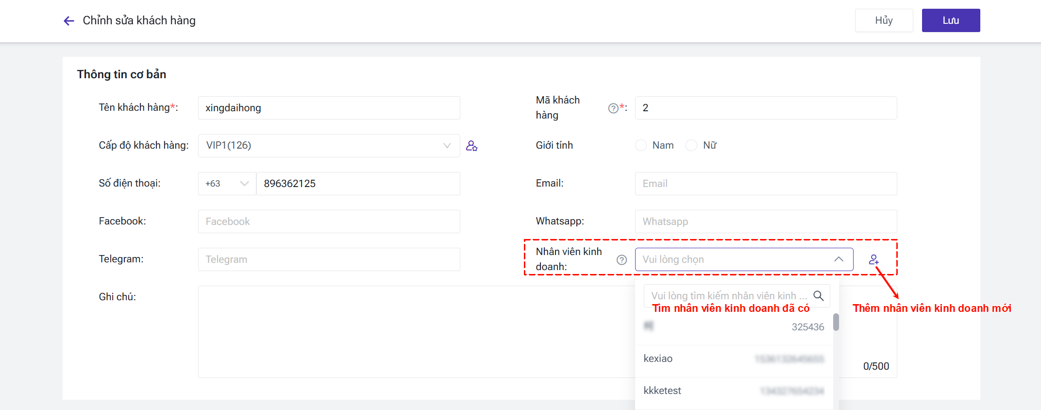 Trong cửa sổ hiện ra, nhấn [+Thêm nhân viên kinh doanh], nhập Tên và Số điện thoại. Tại đây, bạn có thể tìm kiếm theo tên, chỉnh sửa hoặc xóa thông tin nhân viên.
