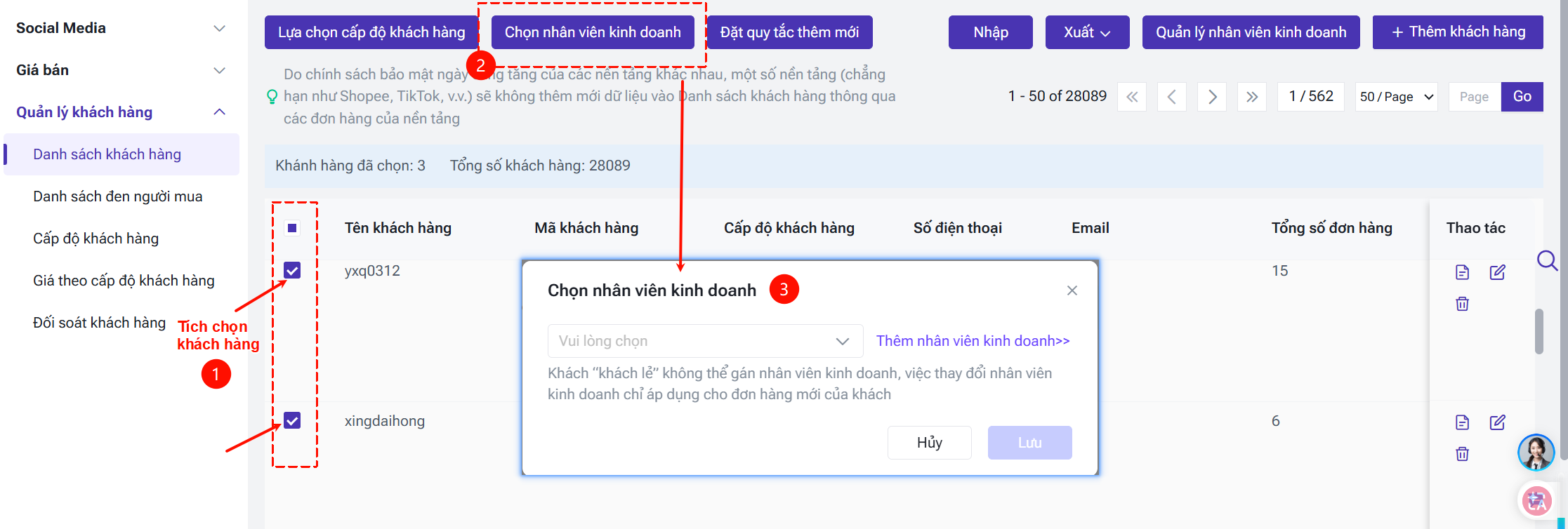 ② Liên kết hàng loạt: Tích chọn nhiều khách hàng trong danh sách, sau đó nhấn [Chọn nhân viên kinh doanh].