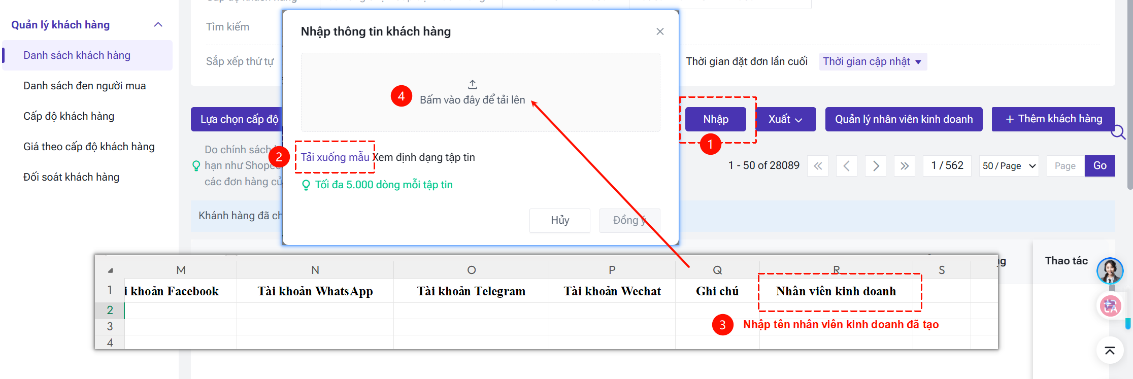 ③ Nhập tập tin: Hỗ trợ nhập hàng loạt mối quan hệ giữa khách hàng và nhân viên kinh doanh thông qua file nhập thông tin khách hàng.