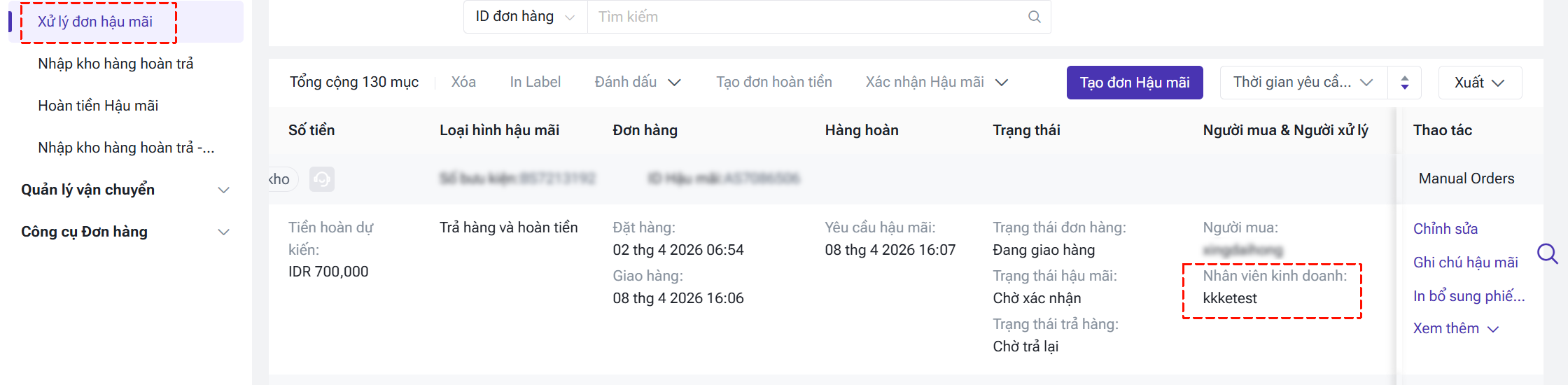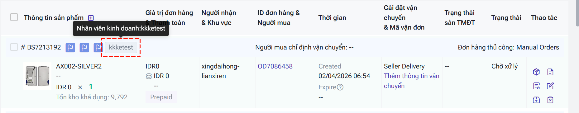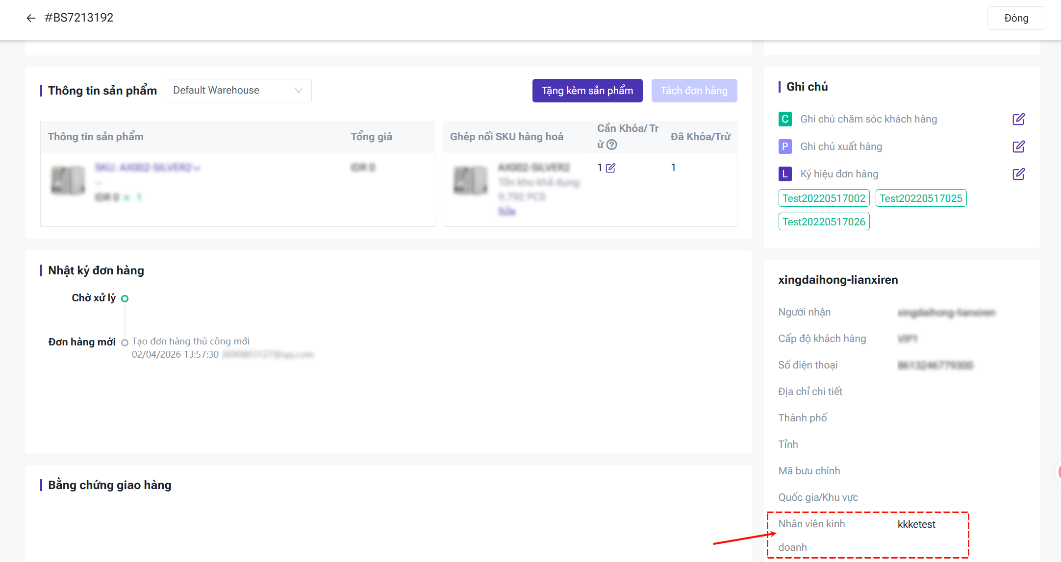 ① Tự động liên kết: Nếu khách hàng trong đơn hàng đã được liên kết với nhân viên kinh doanh, hệ thống sẽ tự động hiển thị tên nhân viên đó cho đơn hàng.