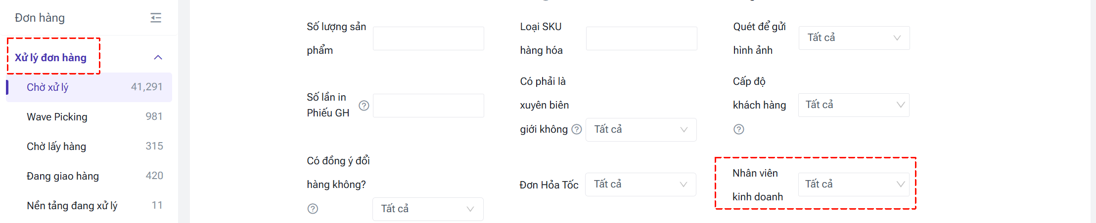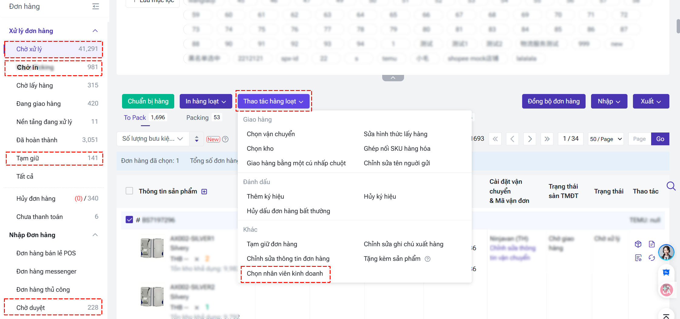 ② Chỉnh sửa thủ công (Hỗ trợ đơn hàng thủ công / đơn hàng messenger): Tại các trang xử lý đơn hàng (Chờ xử lý, Chờ in, Tạm giữ, Chờ duyệt), tích chọn đơn hàng > nhấn [Thao tác hàng loạt] > [Chọn nhân viên kinh doanh].