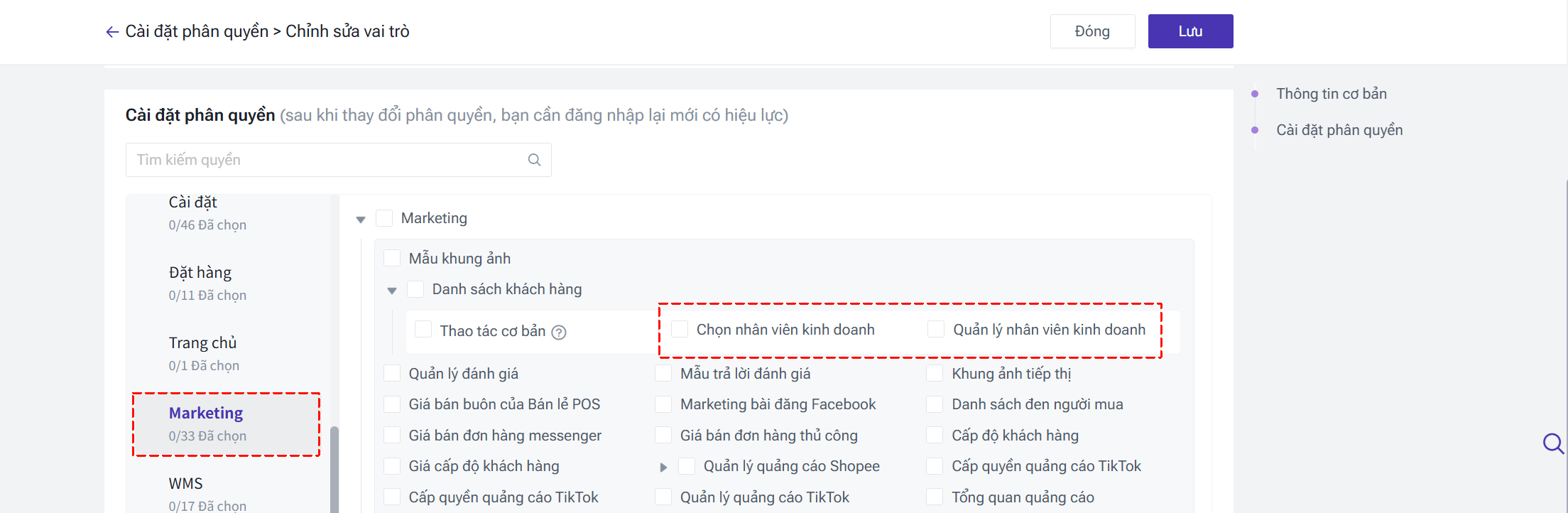 Web > Marketing > Danh sách khách hàng: Tích chọn quyền [Chọn nhân viên kinh doanh] và quyền [Quản lý nhân viên kinh doanh]