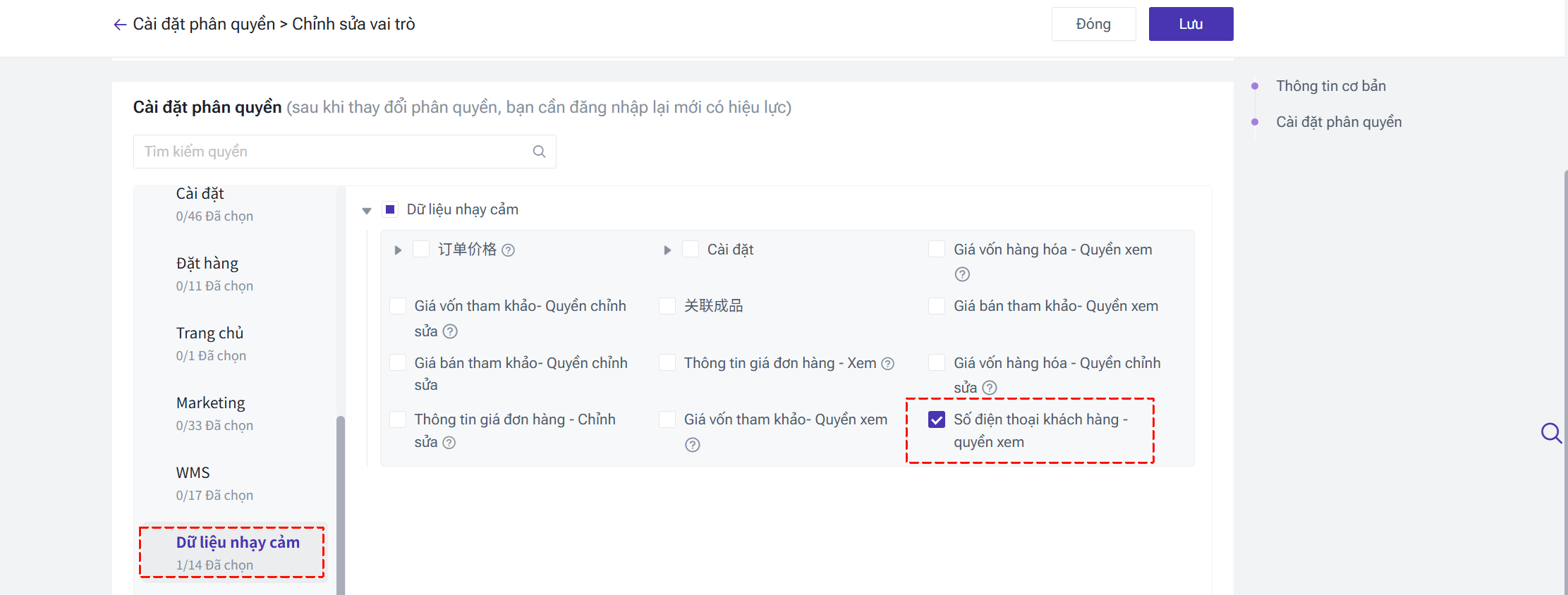 Web > Dữ liệu nhạy cảm > Số điện thoại khách hàng - quyền xem: Kiểm soát việc ẩn/hiện dữ liệu nhạy cảm. Nếu không có quyền, khi xem chi tiết đơn hàng hoặc xuất dữ liệu đơn hàng, số điện thoại sẽ bị ẩn (VD: +86 ******7413).