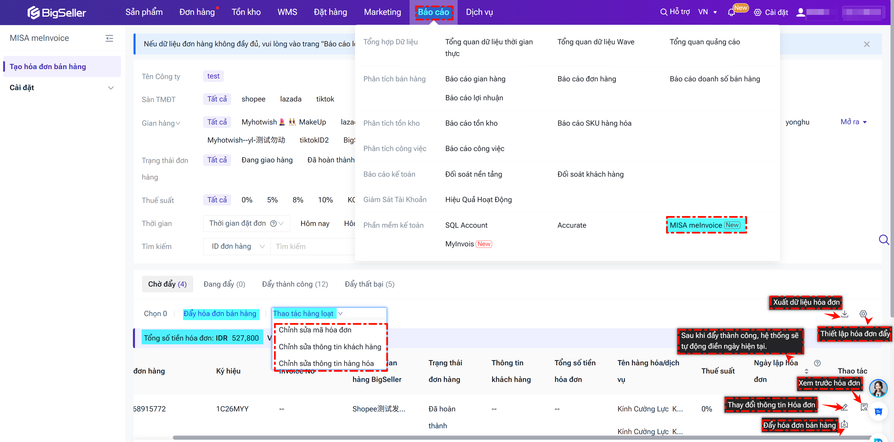 Sau khi ủy quyền tài khoản MISA meInvoice vào BigSeller và xử lý đơn trên BigSeller, BigSeller có thể thực hiện đẩy đơn hàng sang Tài khoản MISA meInvoice mà bạn đã kết nối vào BigSeller bằng một cú nhấp chuột, thuận tiện cho việc đồng bộ hóa đơn hàng và thông tin hàng tồn kho, nhanh chóng tạo hóa đơn, tạo điều kiện thống kê tài chính và nộp thuế. (Tính năng này chỉ hỗ trợ các tài khoản đã mua gói VIP BigSeller).
