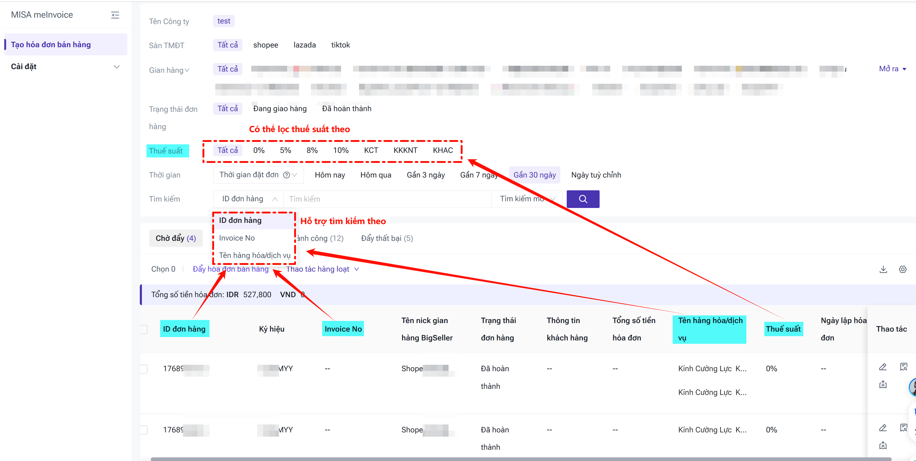 3. Trường Tên hàng hóa/dịch vụ, ID đơn hàng và Invoice No hỗ trợ tìm kiếm, còn với trường Thuế suất, bạn có thể lọc nhanh theo mức thuế mong muốn.