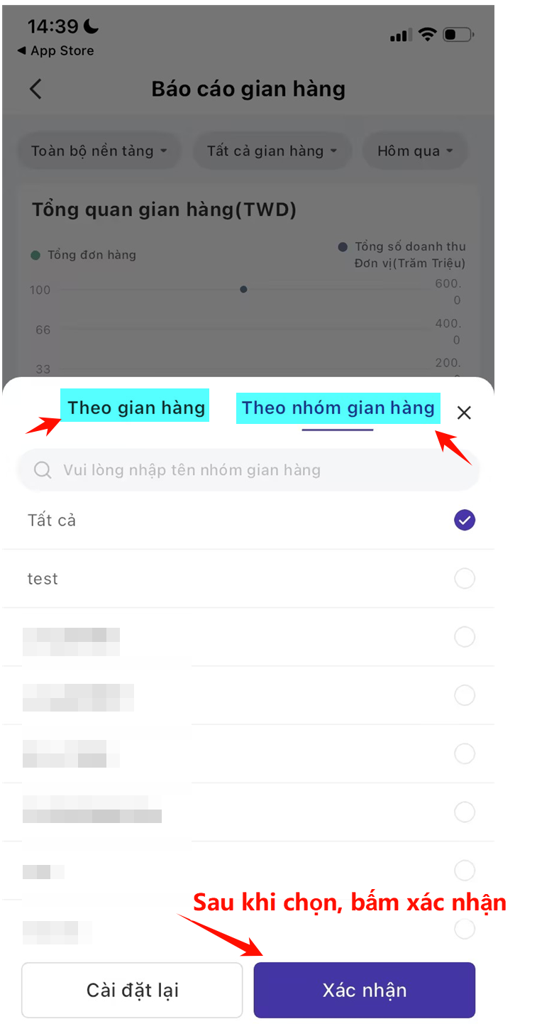 Lọc gian hàng: Bấm vào đây bạn có thể lọc dữ liệu báo cáo theo gian hàng, bạn có thể check báo cáo từng shop hoặc nhiều shop cùng môt lúc, lụa chọn xong bấm Xác nhận.