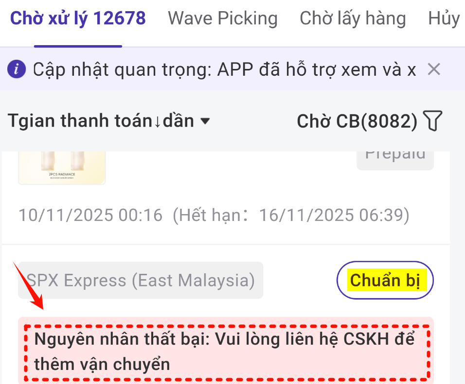 Đơn chuẩn bị hàng thất bại hoặc hết hàng sẽ hiển thị nguyên nhân thất bại.