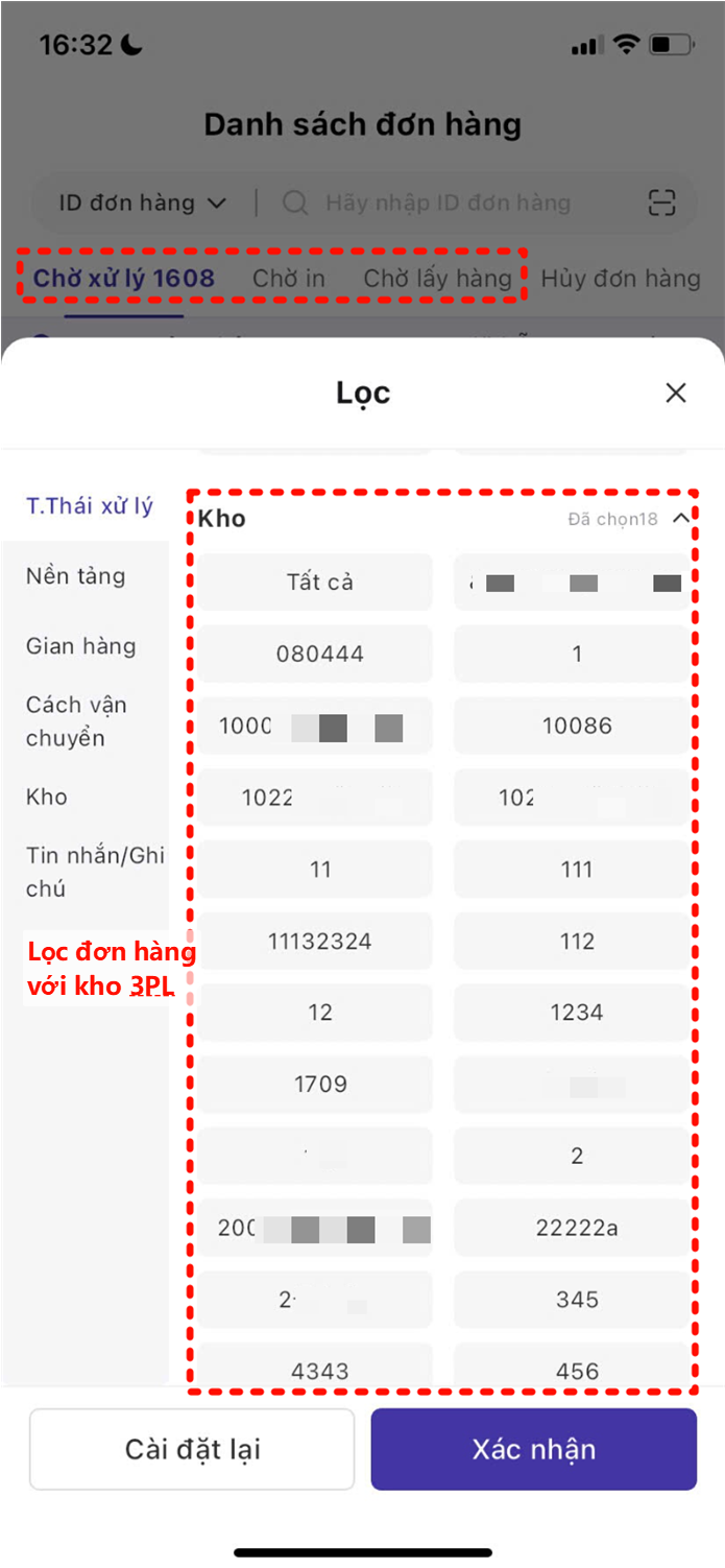 Trên các trang Chờ xử lý, Chờ in/Wave Picking, Chờ lấy hàng, bạn có thể lọc đơn hàng theo kho bên thứ ba.
