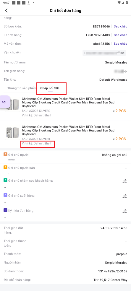 Khi bạn chọn hiển thị Ghép nối SKU sẽ hiển thị vị trí kệ SKU để tiện cho việc đóng gói