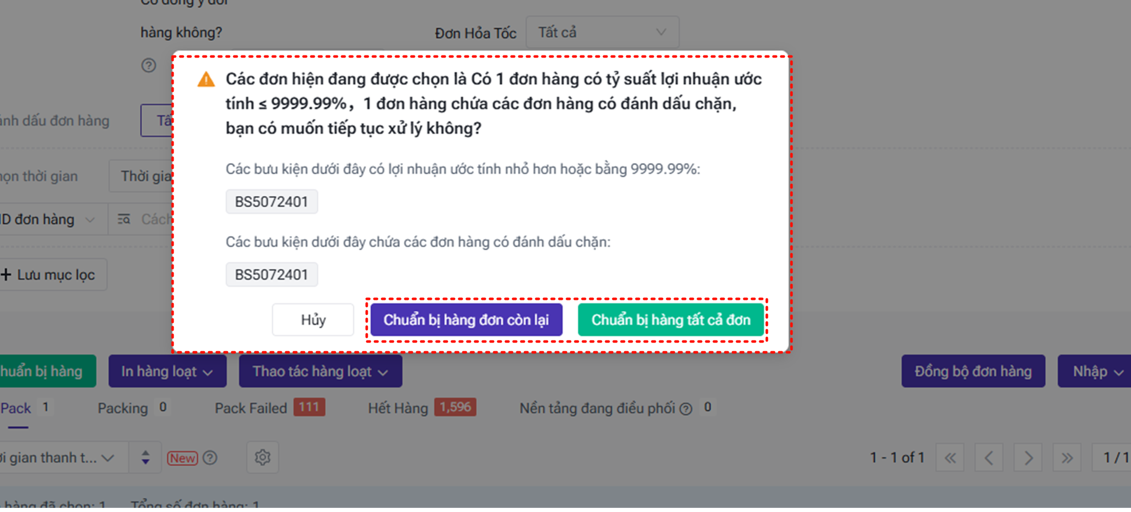 Khi bạn thực hiện thao tác chuẩn bị hàng cho đơn hàng, nếu phát hiện đơn hàng vi phạm các quy tắc đã thiết lập, hệ thống sẽ xuất hiện một cửa sổ Pop-up cảnh báo. Tại đây, bạn có các lựa chọn: