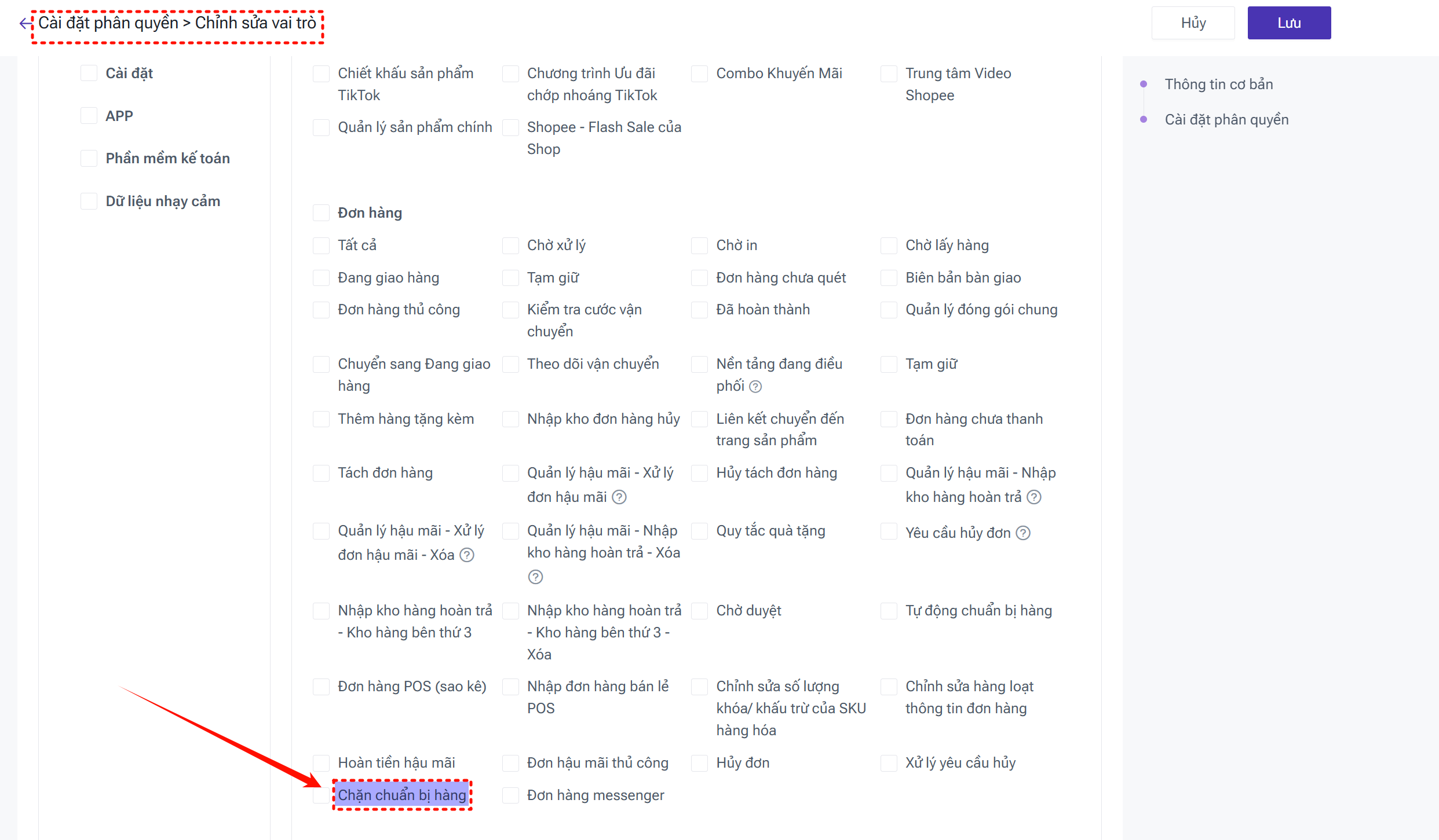 Chủ shop có thể thiết lập quyền "Chặn chuẩn bị hàng" trong mục Cài đặt phân quyền ở mô đun Đơn hàng cho các tài khoản nhân viên (tài khoản phụ) để đảm bảo tính bảo mật và quy trình vận hành.
