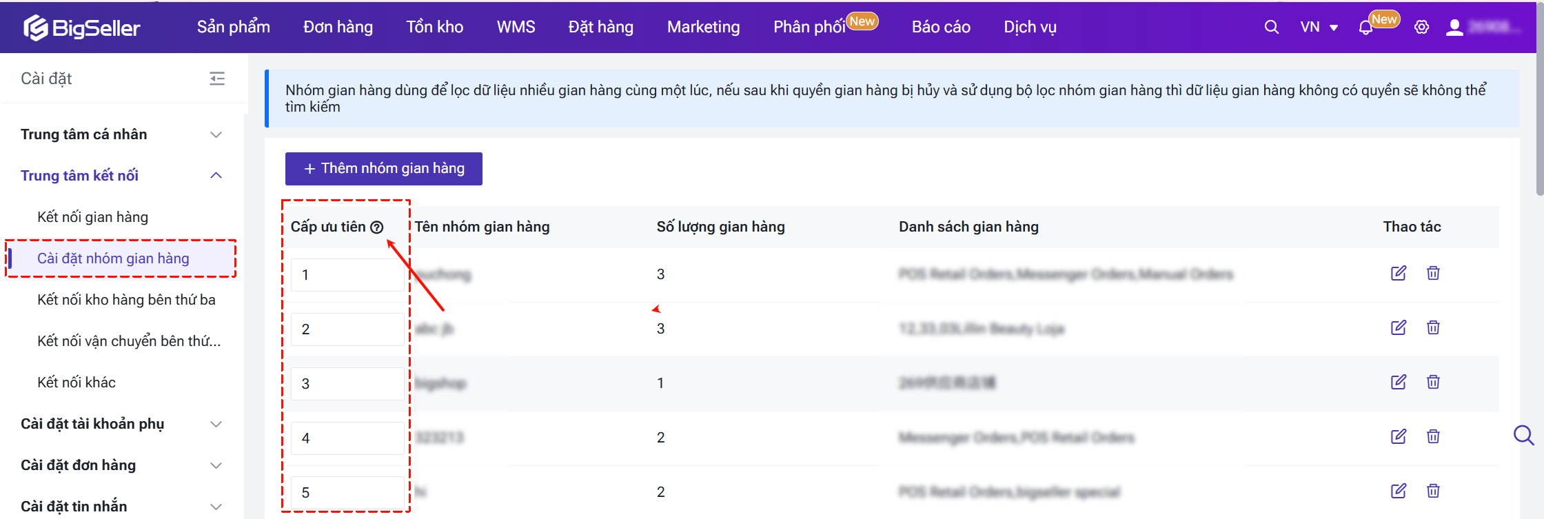 Nếu có nhiều Nhóm gian hàng, bạn có thể tùy chỉnh thứ tự ưu tiên: giá trị số càng nhỏ, mức độ ưu tiên càng cao. Thứ tự hiển thị của các nhóm trên các trang mô-đun Sản phẩm sẽ được sắp xếp dựa theo mức độ ưu tiên này.