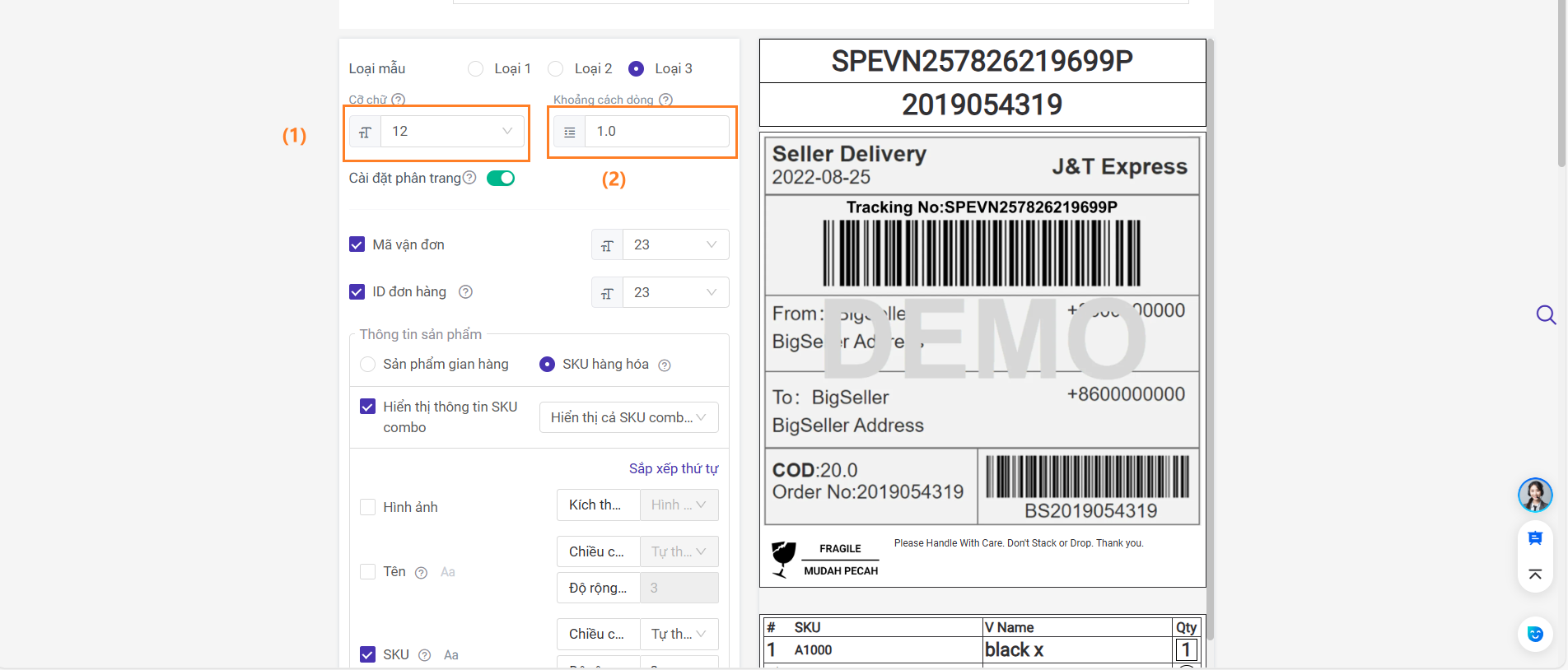 Nếu bạn muốn hiển thị thông tin SKU hàng hóa của BigSeller, thì chọn SKU hàng hóa; Lưu ý: ① Nếu SKU gian hàng chưa ghép nối với SKU hàng hóa và sản phẩm này chưa ghép nối với SKU hàng hóa khi in phiếu giao hàng, hệ thống sẽ sử dụng giá trị tương ứng với SKU gian hàng đó. chỉ chọn SKU hàng hóa mới có thể hỗ trợ tích chọn vị trí. ② Khi mẫu tủy chỉnh là loại 1/2/3 và chọn hiển thị SKU hàng hóa thì người bán có thể tùy chọn: Chỉ hiển thị SKU Combo hoặc Hiển thị cả Combo SKU và các SKU đơn lẻ. Trường hợp hiển thị cả Combo SKU và SKU đơn lẻ Combo SKU & SKU đơn độc hiển thị ở cấp 1, SKU đơn độc trong combo hiển thị ở cấp 2 (phân biệt bằng số thứ tự)