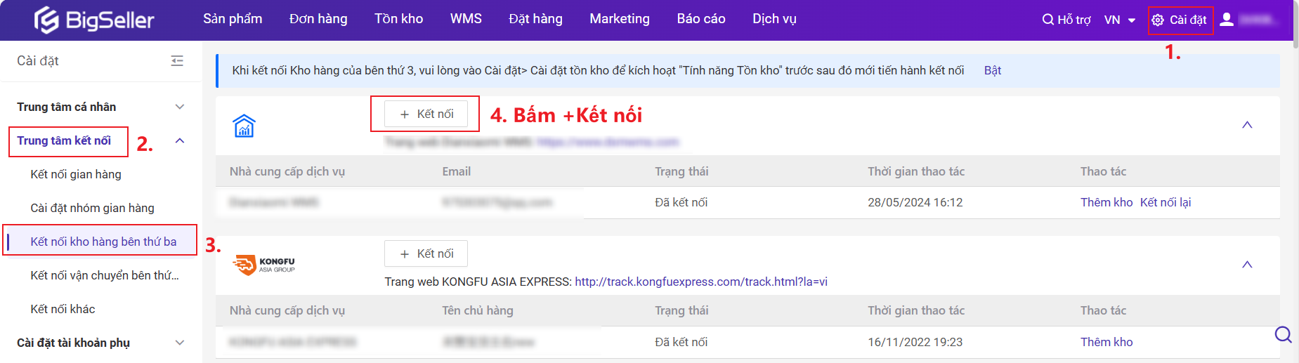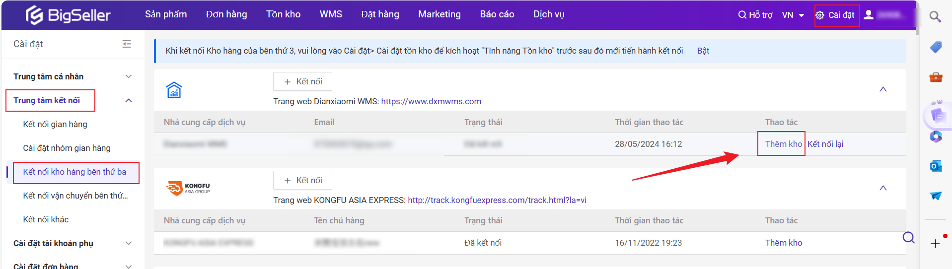 Rồi chuyển sang trang Cài đặt > Trung tâm kết nối > Kết nối kho hàng bên thứ ba > Tìm đến kho hàng bên thứ ba bạn muốn kết nối > Bấm + Kết nối, Rồi Thêm kho.