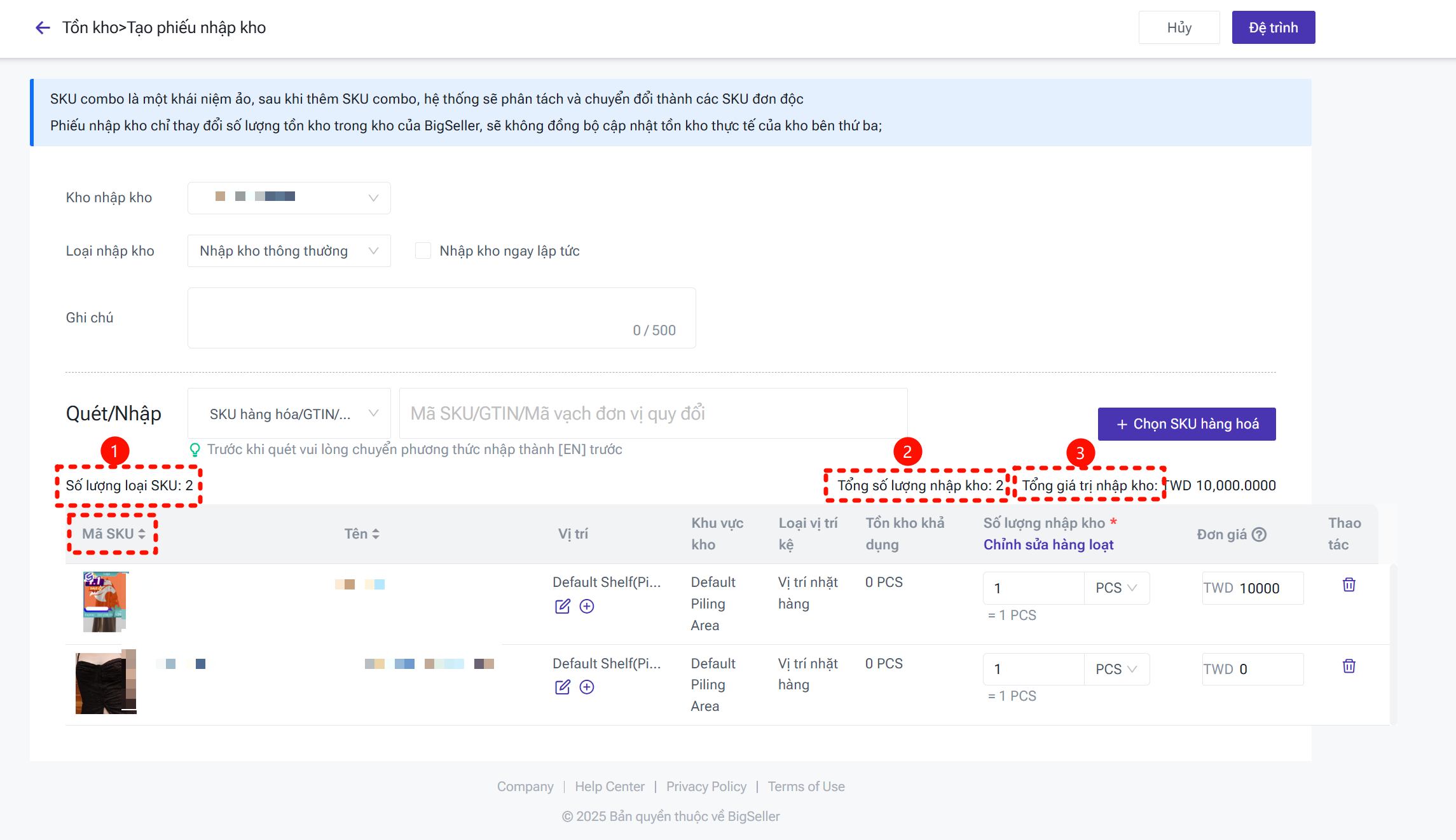 Ps: ① Với kho “Một SKU – Một vị trí” và “Kho phân vùng lưu trữ & nhặt hàng”, hệ thống hỗ trợ nhập phiếu nhập kho theo mã GTIN.